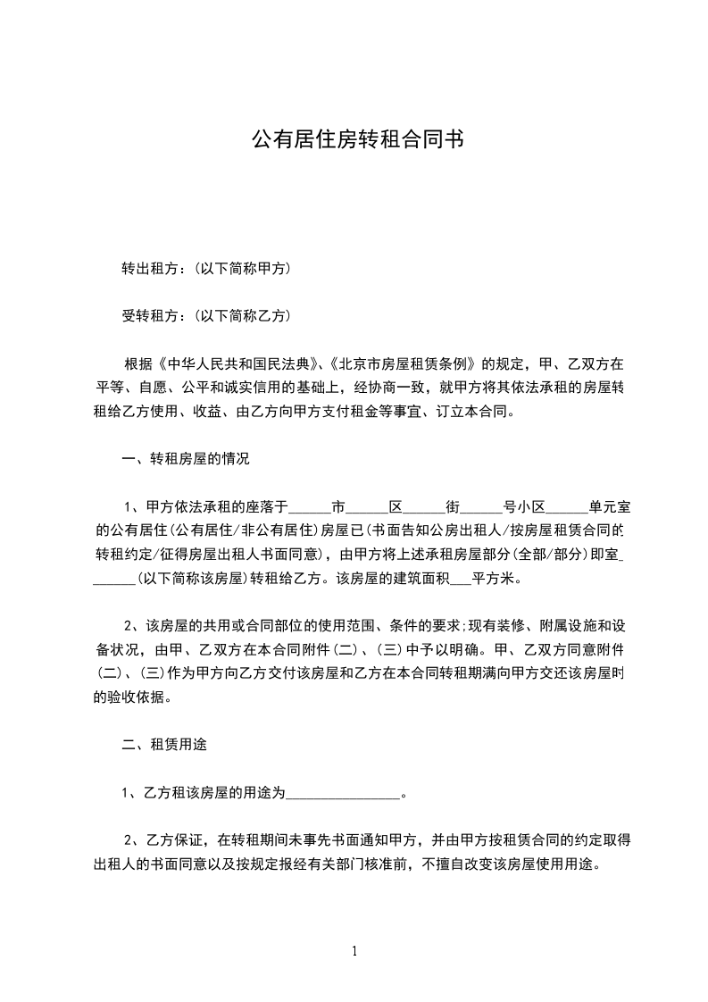 根据《中华人民共和国民法典》、《北京市房屋租赁条例》的规定,甲、乙双方在平等、自愿、公平和诚实信用的基础上,经协商一致,就甲方将其依法承租的房屋转租给乙方使用、收益、由乙方向甲方支付租金等事宜、订立本合同。