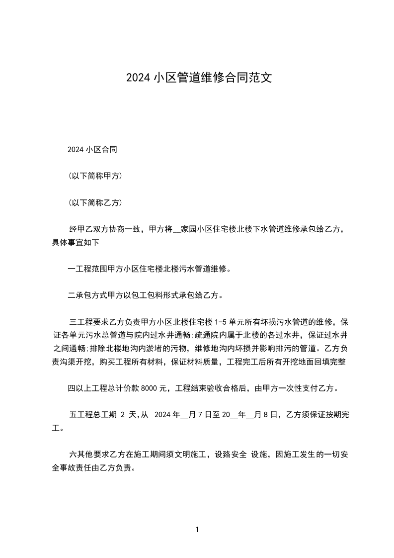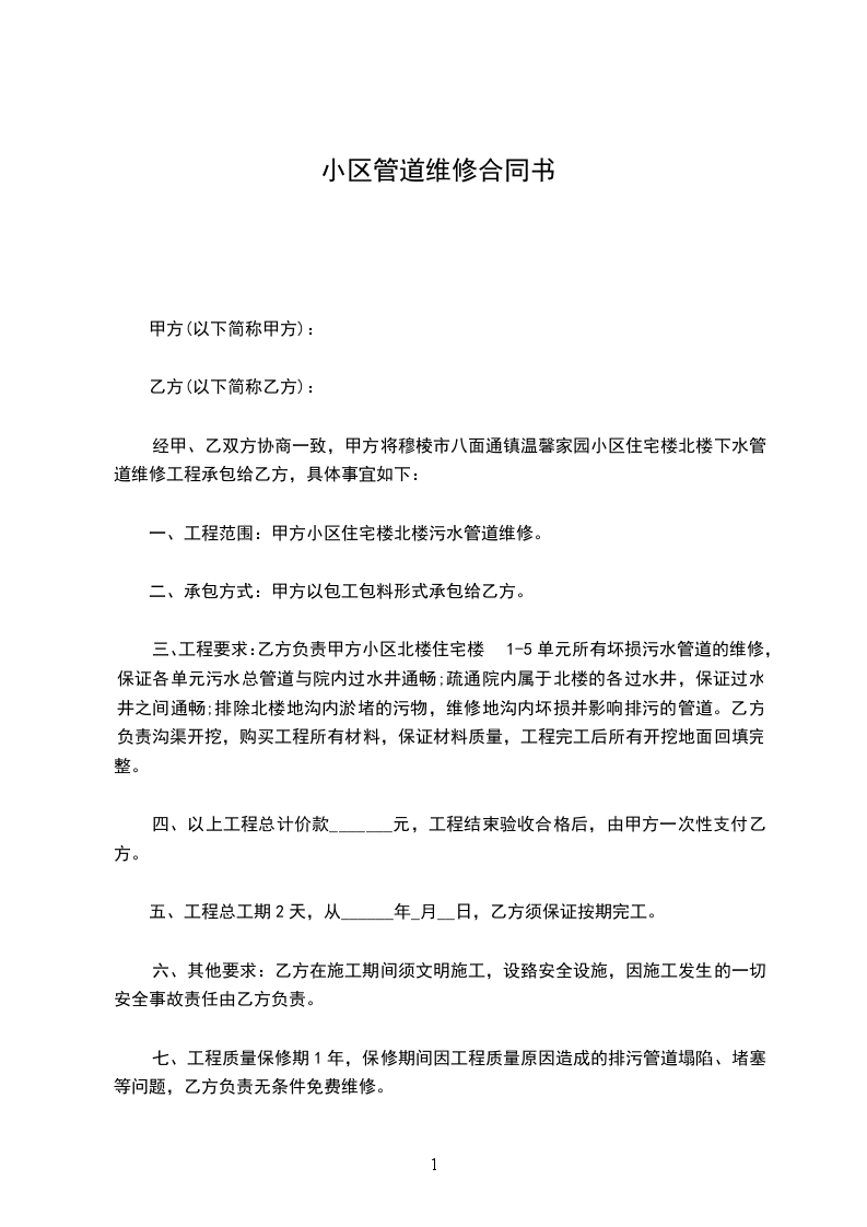 经甲、乙双方协商一致,甲方将穆棱市八面通镇温馨家园小区住宅楼北楼下水管道维修工程承包给乙方,具体事宜如下:
