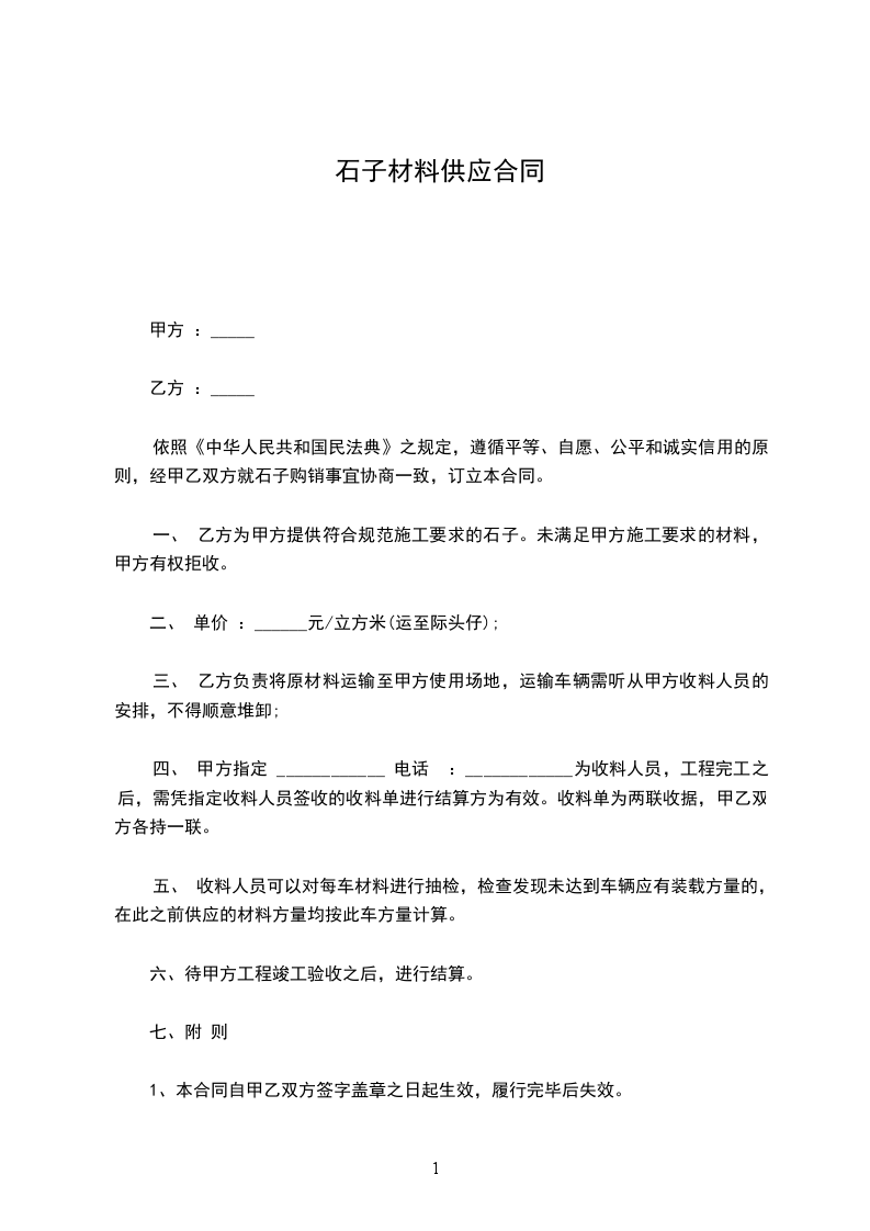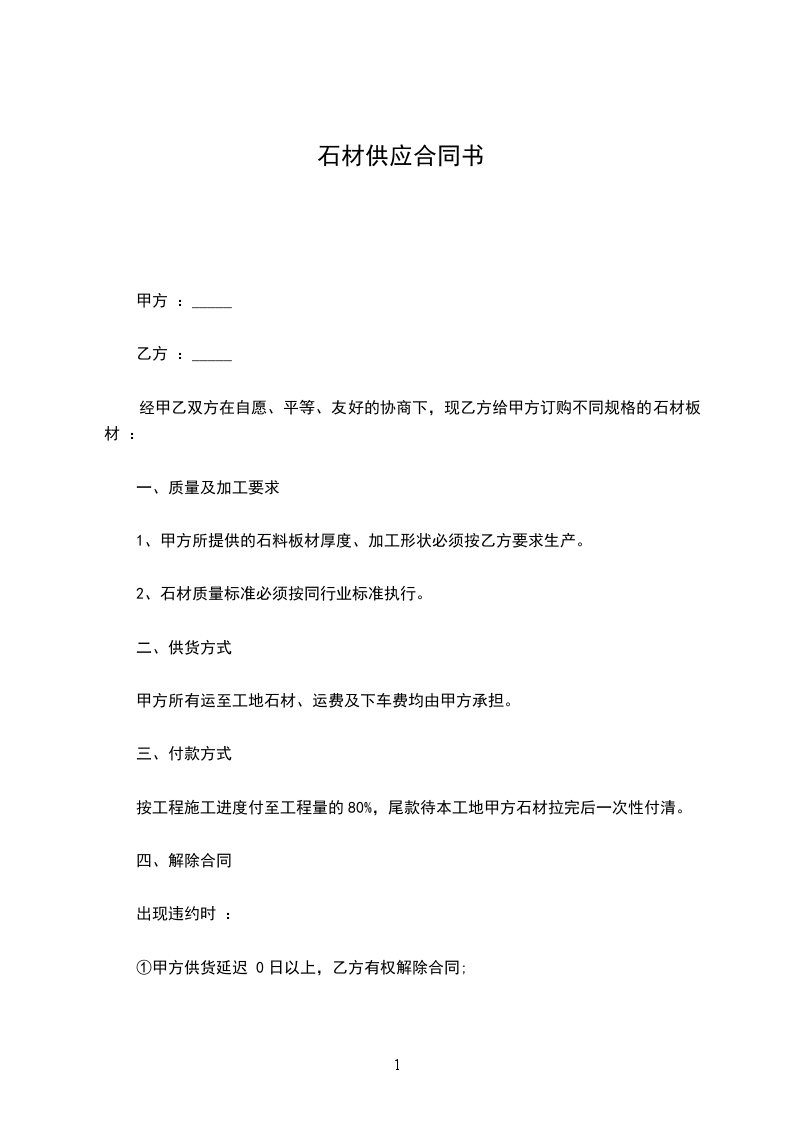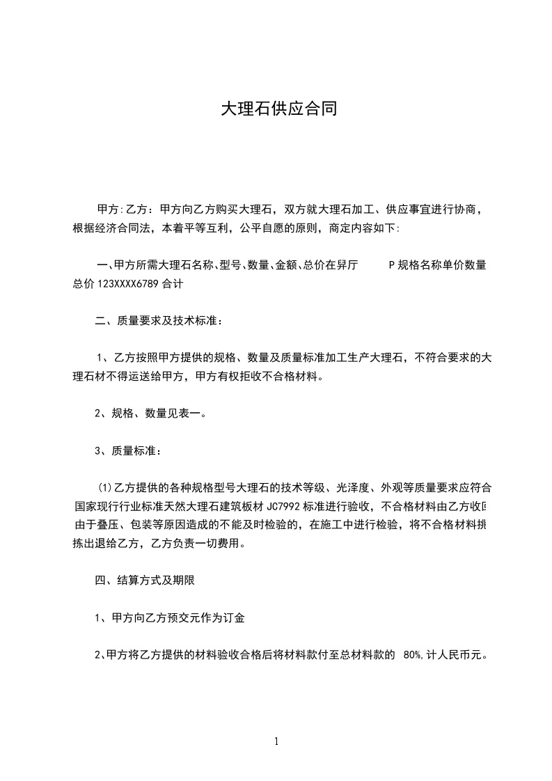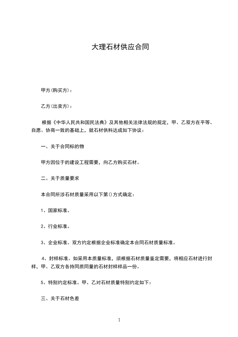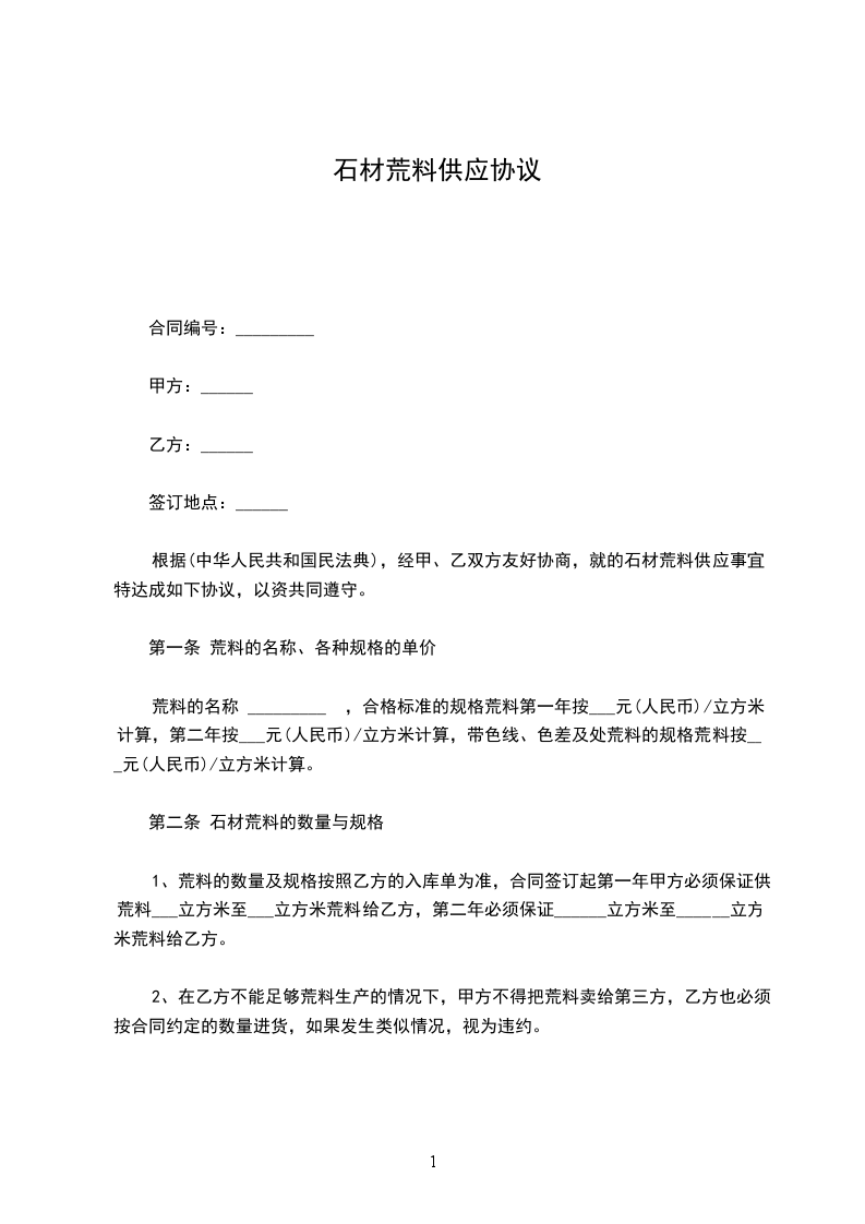 根据《中华人民共和国民法典》及其他相关法律法规的规定,甲、乙双方在平等、自愿、协商一致的基础上,就石材供料达成如下协议:
