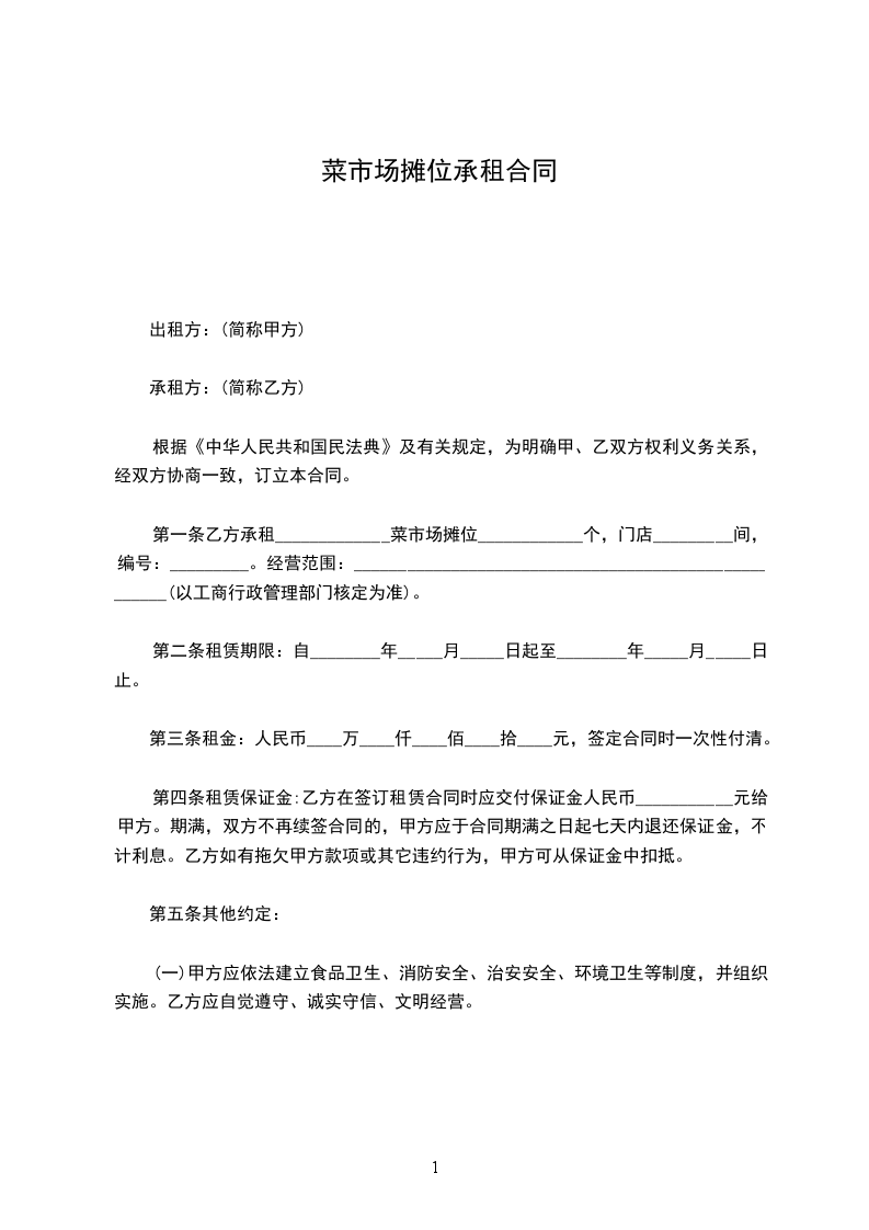 第一条乙方承租_____________菜市场摊位____________个,门店_________间,编号:_________。经营范围:_____________________________________________________(以工商行政管理部门核定为准)。
