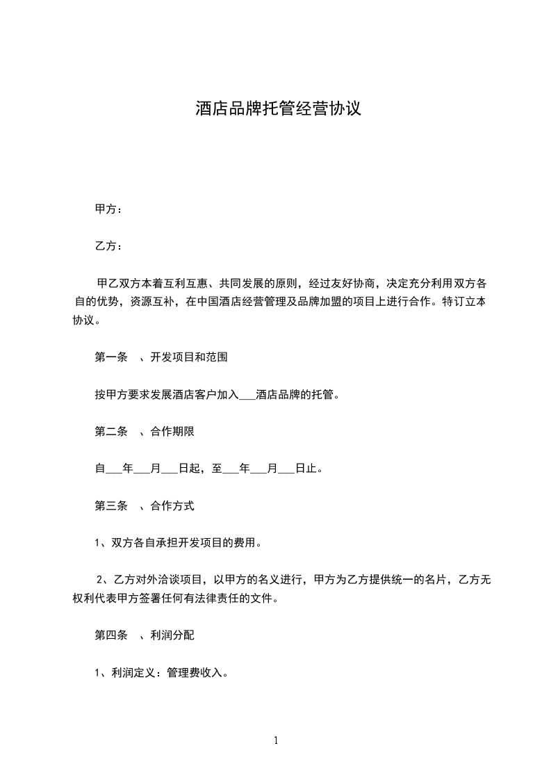 甲乙双方本着互利互惠、共同发展的原则,经过友好协商,决定充分利用双方各自的优势,资源互补,在中国酒店经营管理及品牌加盟的项目上进行合作。特订立本协议。