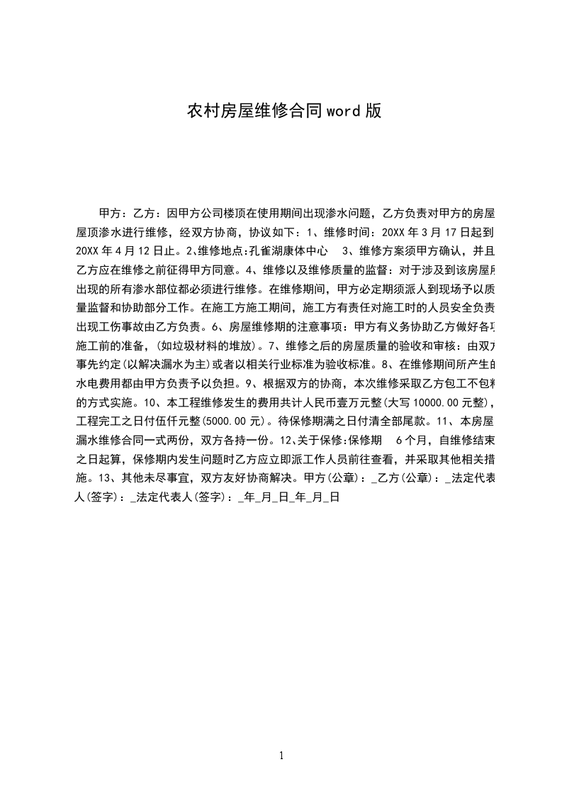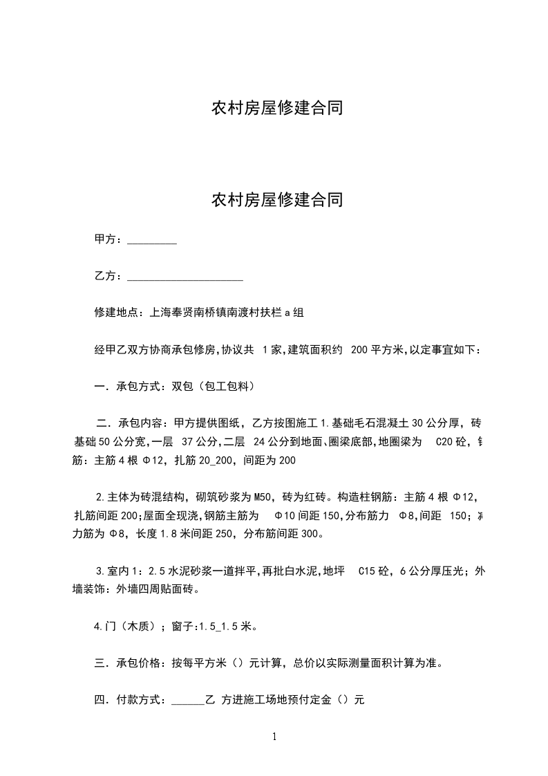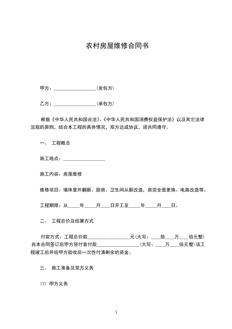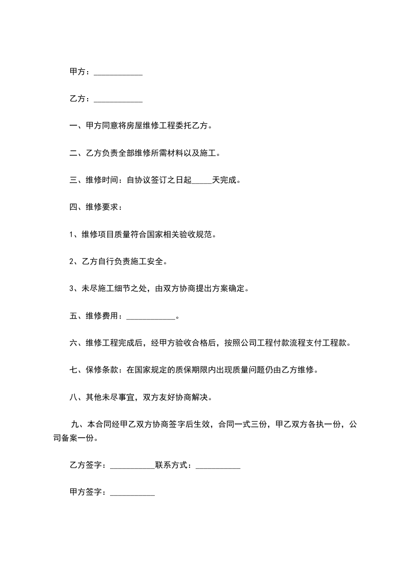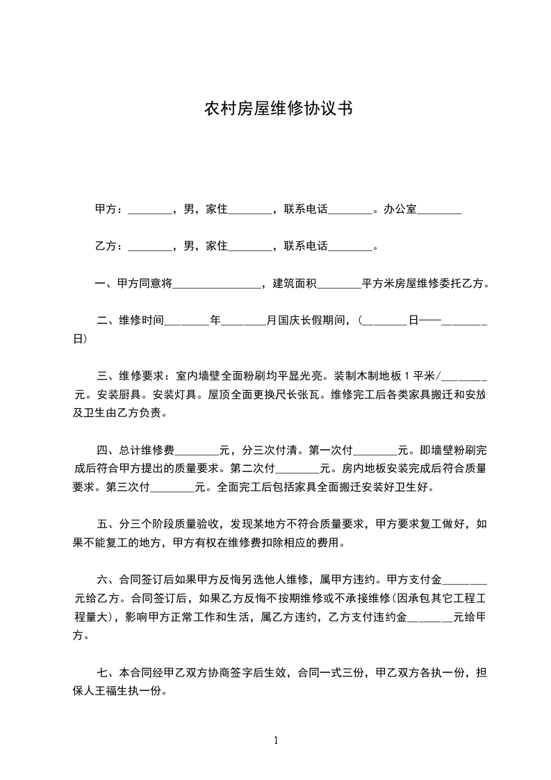 三、维修要求:室内墙壁全面粉刷均平显光亮。装制木制地板1平米/________元。安装厨具。安装灯具。屋顶全面更换尺长张瓦。维修完工后各类家具搬迁和安放及卫生由乙方负责。