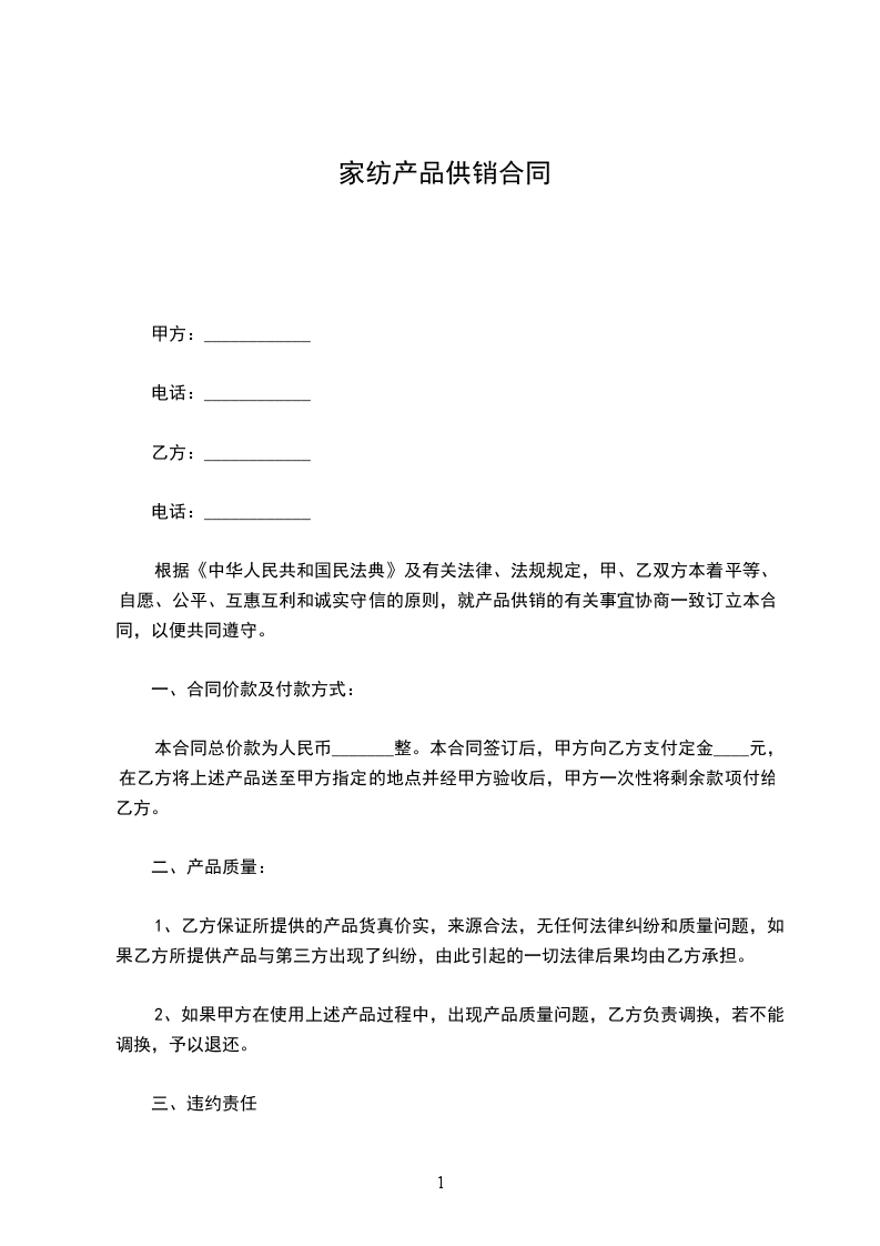 根据《中华人民共和国民法典》及有关法律、法规规定,甲、乙双方本着平等、自愿、公平、互惠互利和诚实守信的原则,就产品供销的有关事宜协商一致订立本合同,以便共同遵守。