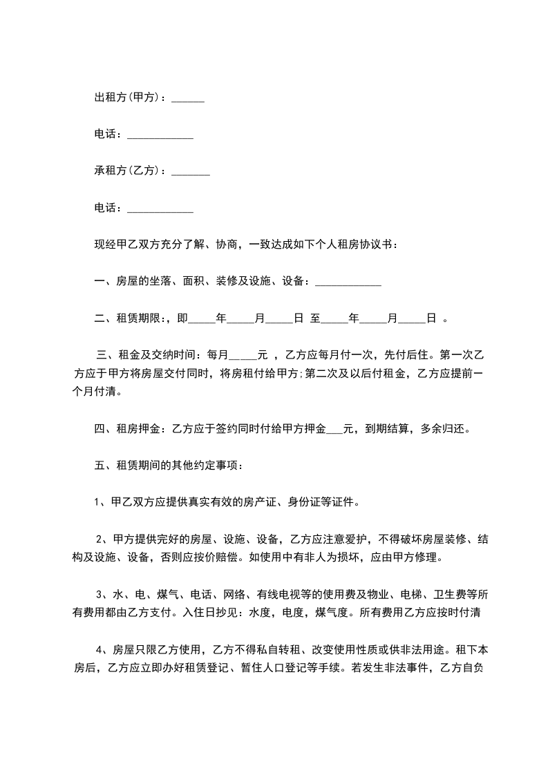 现经甲乙双方充分了解、协商,一致达成如下个人租房协议书: