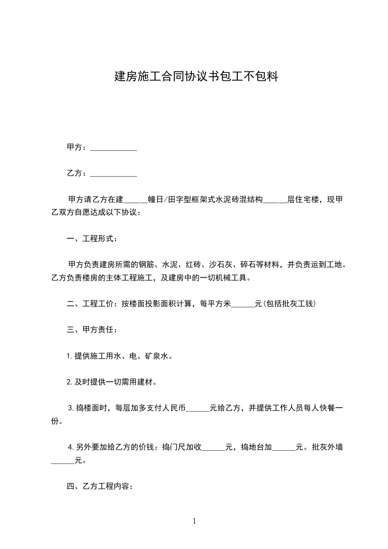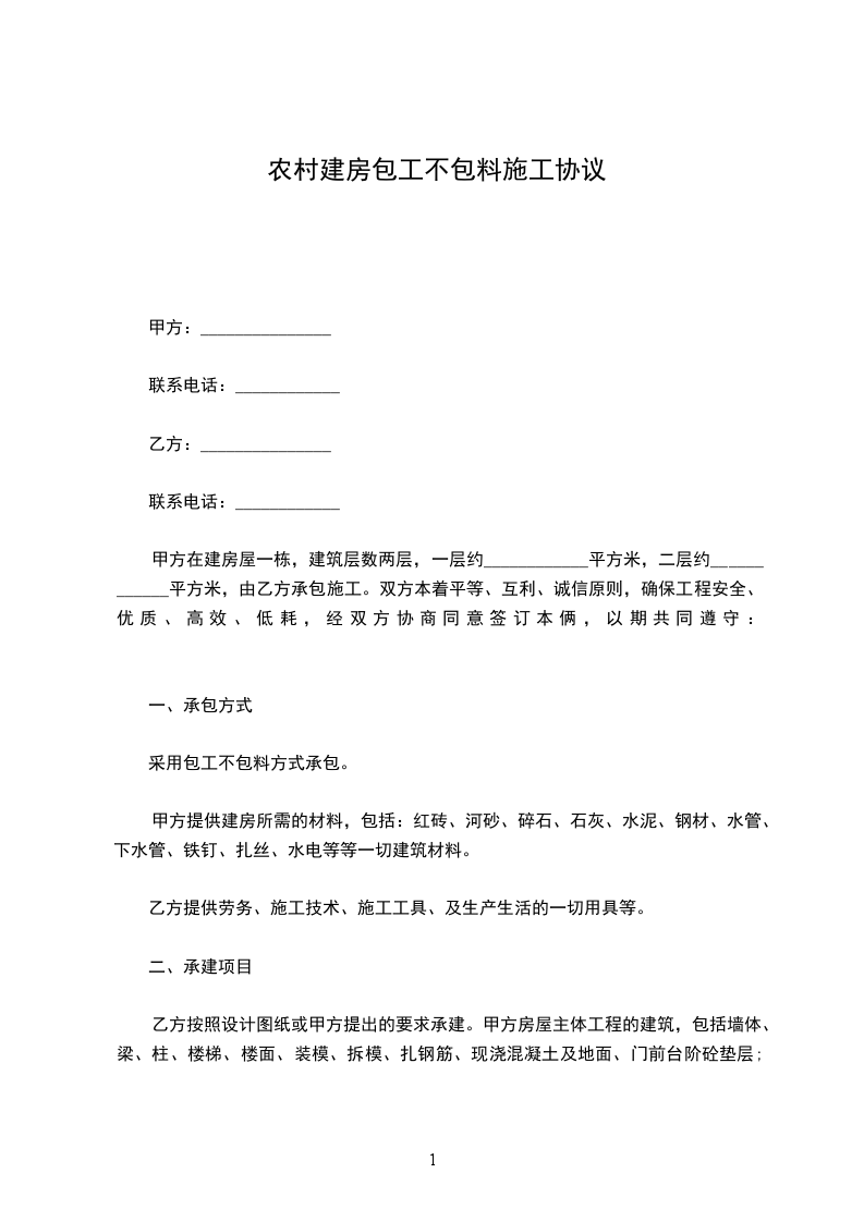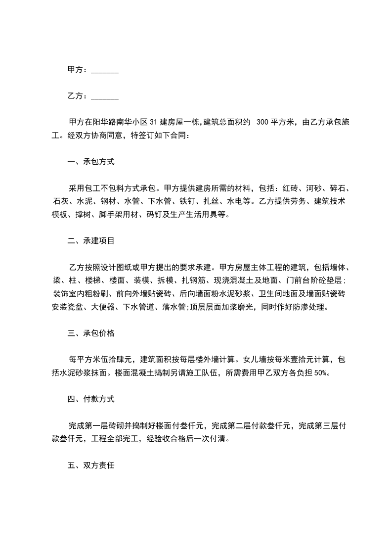 甲方在建房屋一栋,建筑层数两层,一层约________平方米,二层约________平方米,由乙方承包施工。双方本着平等、互利、诚信原则,确保工程安全、优质、高效、低耗,经双方协商同意签订本俩,以期共同遵守:
