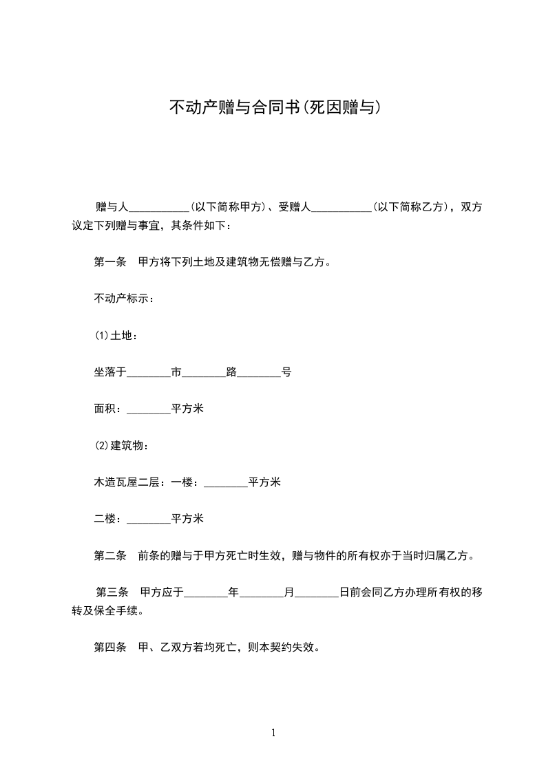 第一条 甲方将下列土地及建筑物无偿赠与乙方。
