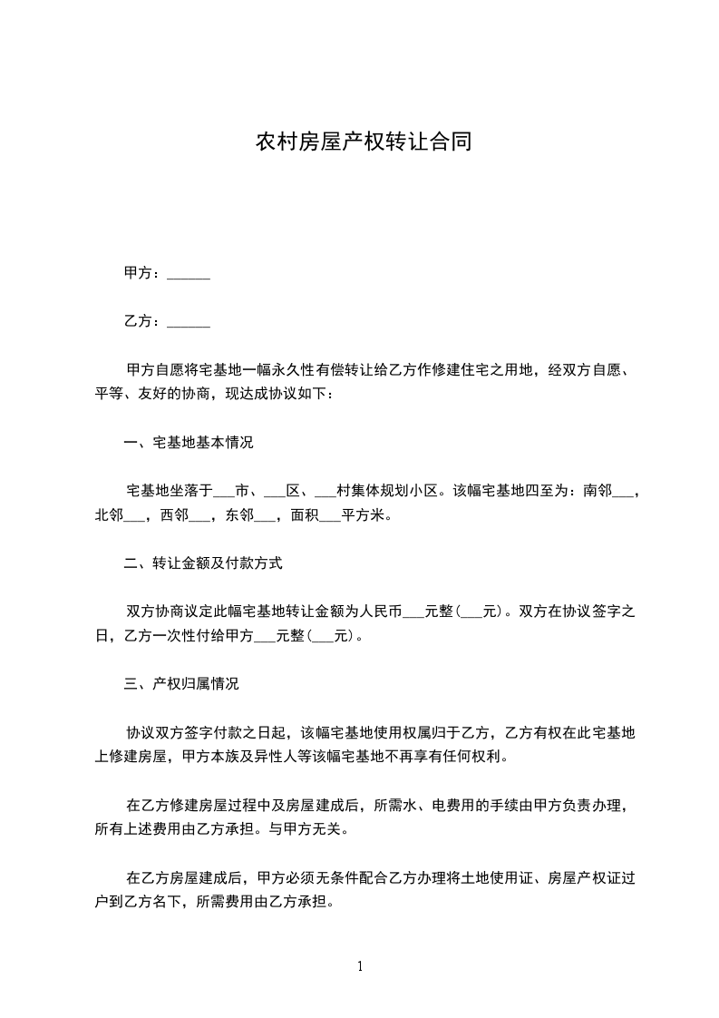 第一条甲方自愿将自有坐落在_______________房屋(包括使用权(土地使用权书证号为_______________)及相应的土地)有偿转让给乙方。