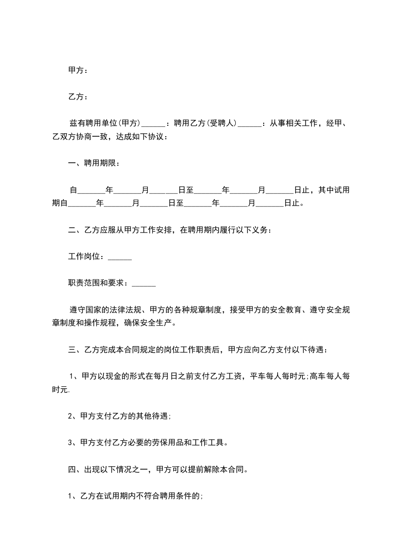 兹有聘用单位(甲方)______:聘用乙方(受聘人)______:从事相关工作,经甲、乙双方协商一致,达成如下协议: