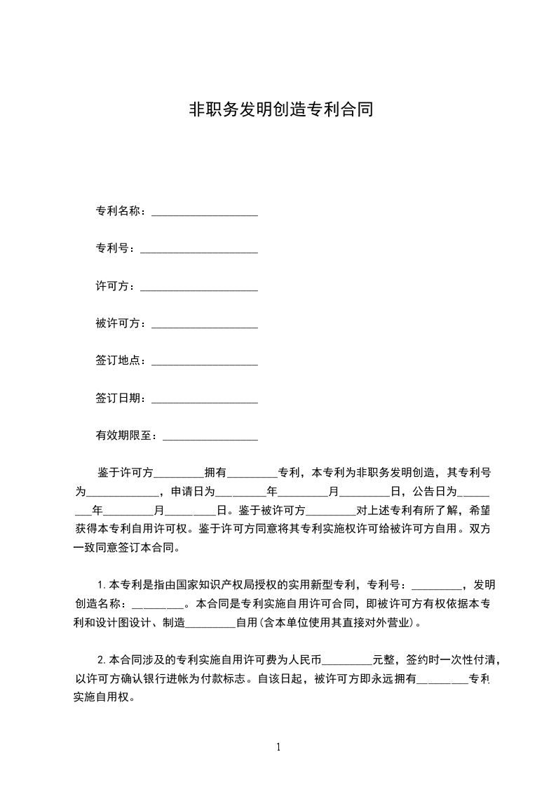 1.本专利是指由国家知识产权局授权的实用新型专利,专利号:_________,发明创造名称:_________。本合同是专利实施自用许可合同,即被许可方有权依据本专利和设计图设计、制造_________自用(含本单位使用其直接对外营业)。