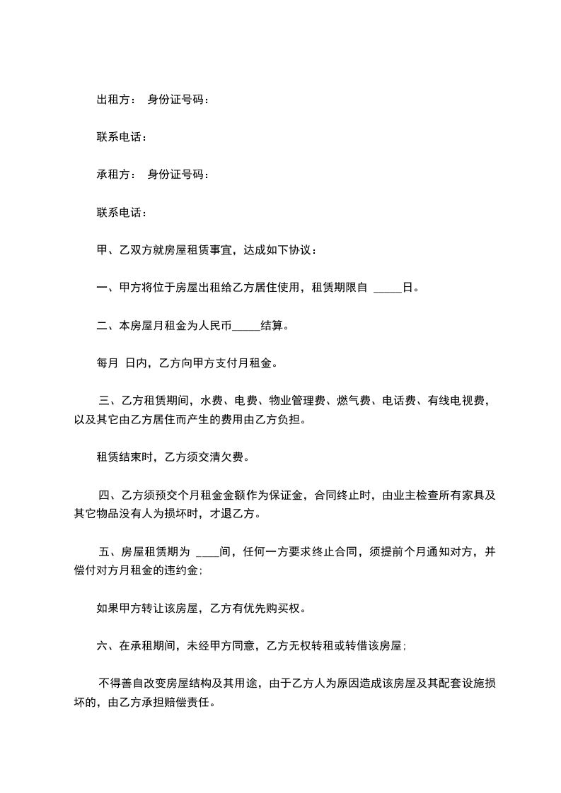 五、房屋租赁期为 ____间,任何一方要求终止合同,须提前个月通知对方,并偿付对方月租金的违约金;