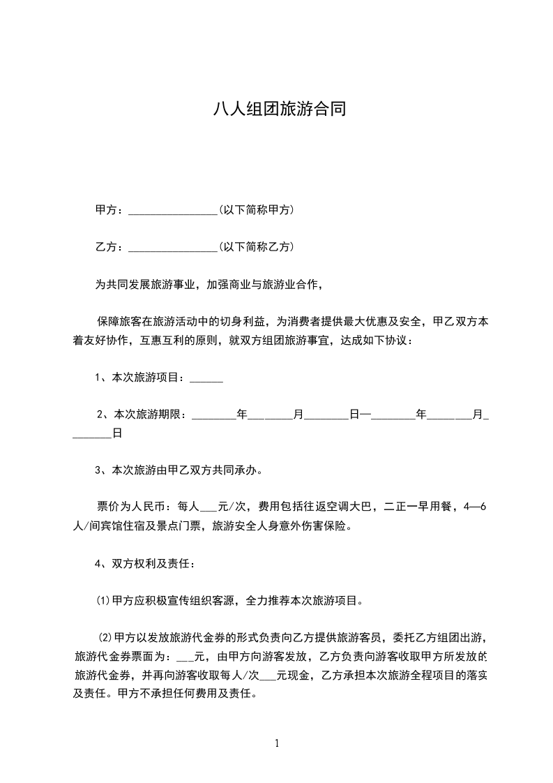 (2)甲方以发放旅游代金券的形式负责向乙方提供旅游客员,委托乙方组团出游,旅游代金券票面为:___元,由甲方向游客发放,乙方负责向游客收取甲方所发放的旅游代金券,并再向游客收取每人/次___元现金,乙方承担本次旅游全程项目的落实及责任。甲方不承担任何费用及责任。