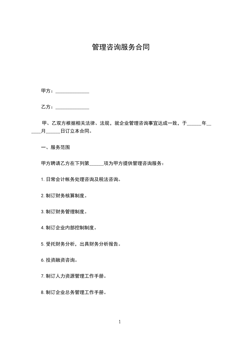 甲方聘请乙方在下列第______项为甲方提供管理咨询服务: