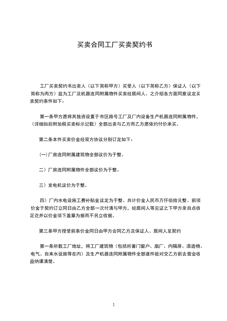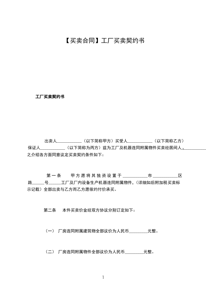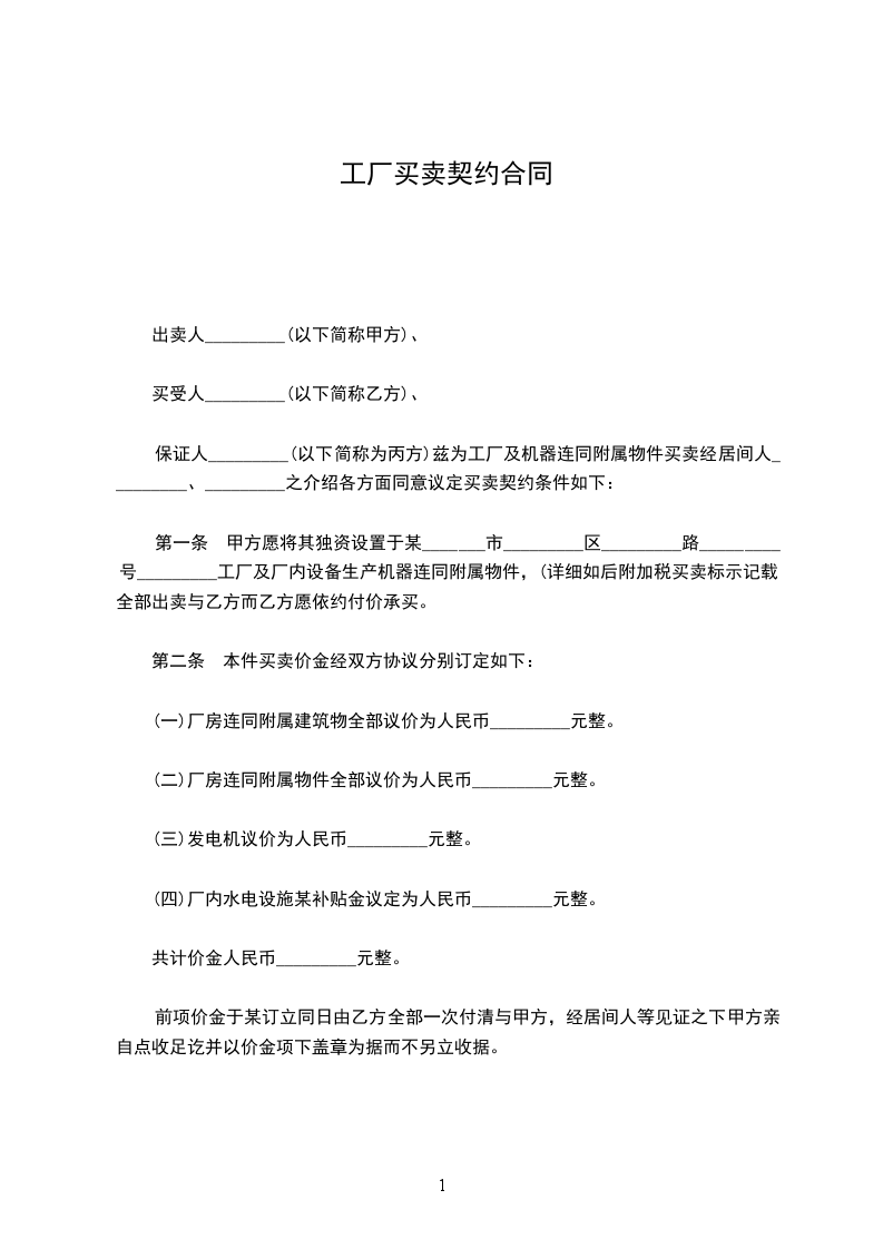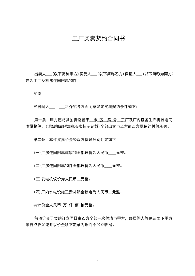 出卖人 (以下简称甲方)买受人 (以下简称乙方)保证人 (以下简称为丙方)兹为工厂及机器连同附属物件买卖经居间人 、 之介绍各方面同意议定买卖契约条件如下: