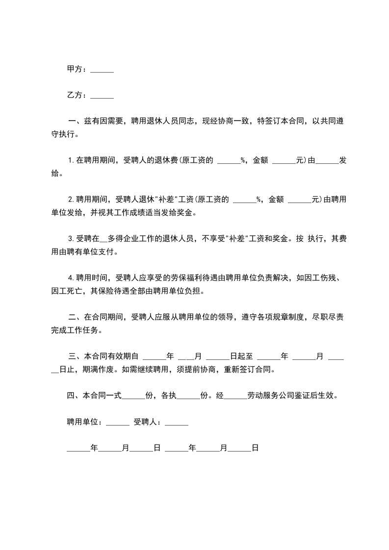一、兹有因需要,聘用退休人员同志,现经协商一致,特签订本合同,以共同遵守执行。