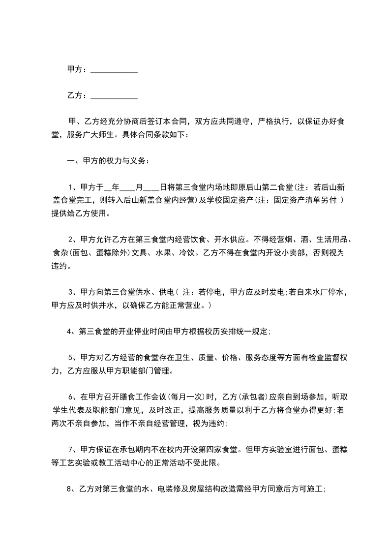 为了完善饭堂管理,保障员工的身体素质,确保办好饭堂伙食,为广大员工服务,并明确甲、乙双方的责任,保障双方利益,特订立以下合约,甲、乙双方共同遵守。