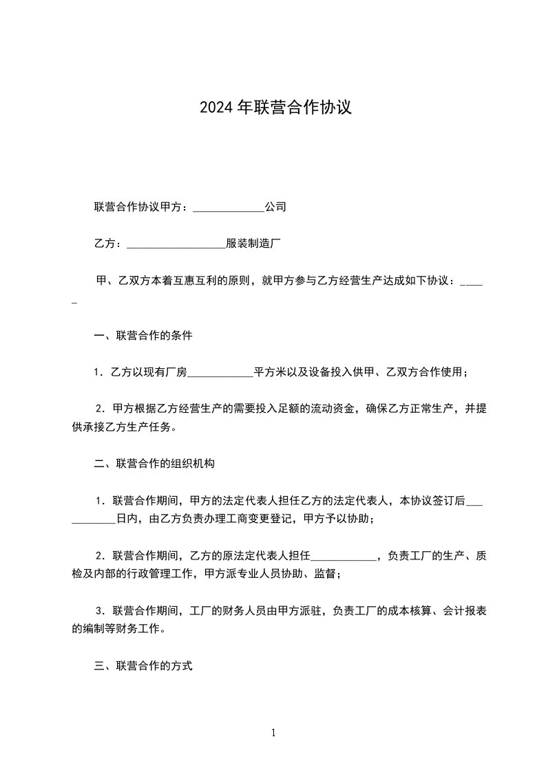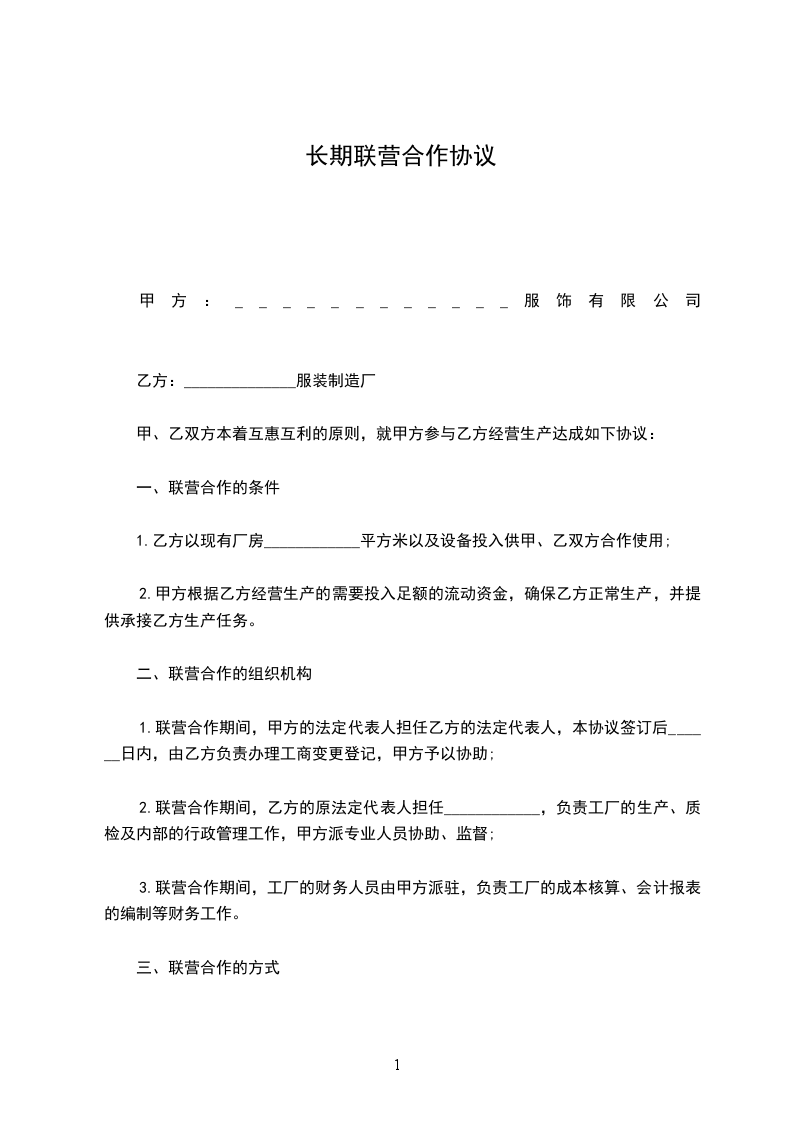 1.联营合作期间,甲方的法定代表人担任乙方的法定代表人,本协议签订后______日内,由乙方负责办理工商变更登记,甲方予以协助;