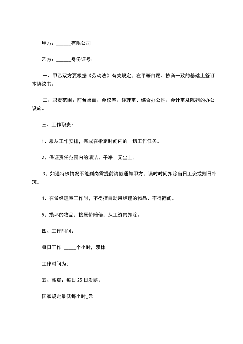 1.同意在甲方指定地点从事清洁工作,遵守指定地点的规章制度和作息时间,以认真负责的态度作好清洁工作。