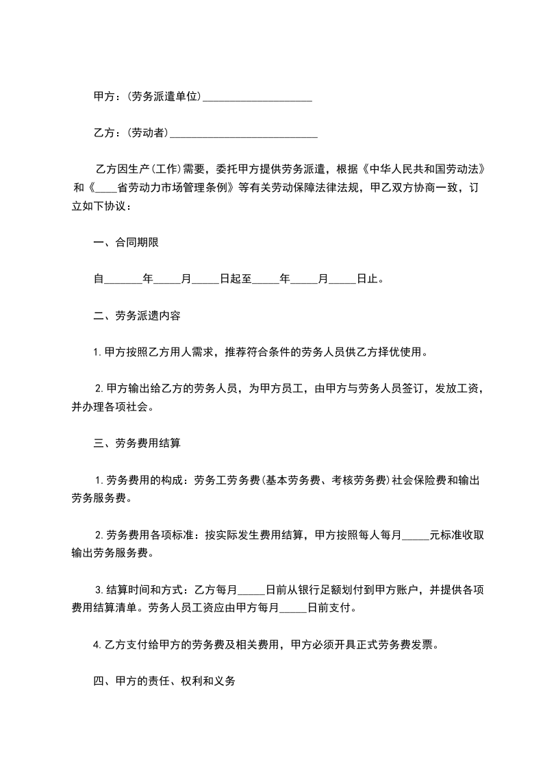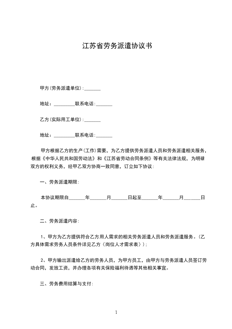 甲方根据乙方的生产(工作)需要,为乙方提供劳务派遣人员和劳务派遣相关服务,根据《中华人民共和国劳动法》和《江苏省劳动合同条例》等有关法律法规,为明确双方的权利义务,经甲乙双方协商一致同意,订立如下协议:
