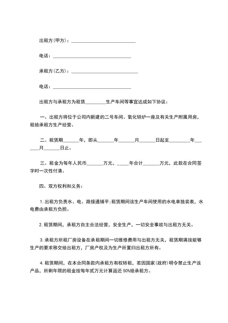 一、出租方将位于公司内新建的二号车间、氧化锌炉一座及有关生产附属用房,租给承租方生产经营。