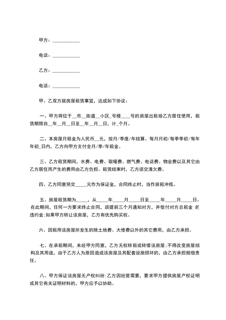 一、甲方将位于__市__街道__小区_号楼____号的房屋出租给乙方居住使用,租赁期限自__年__月__日至__年__月__日,计_个月。