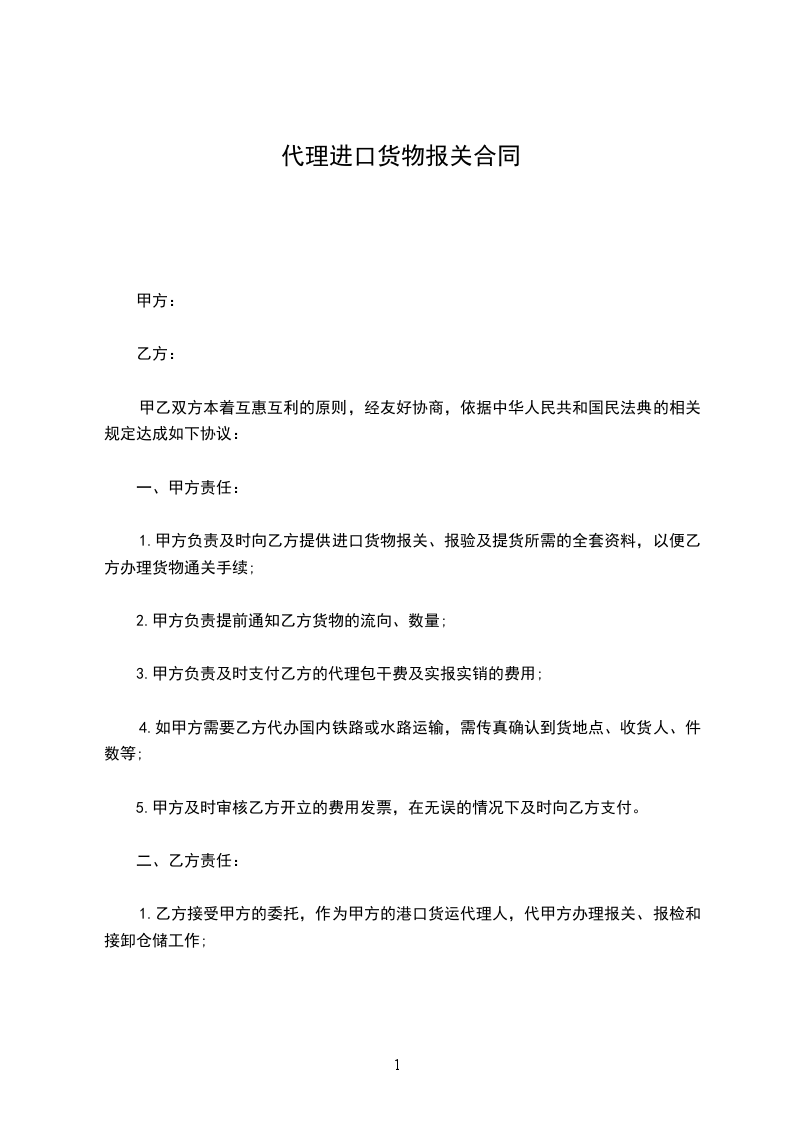 1.乙方接受甲方的委托,作为甲方的港口货运代理人,代甲方办理报关、报检和接卸仓储工作;