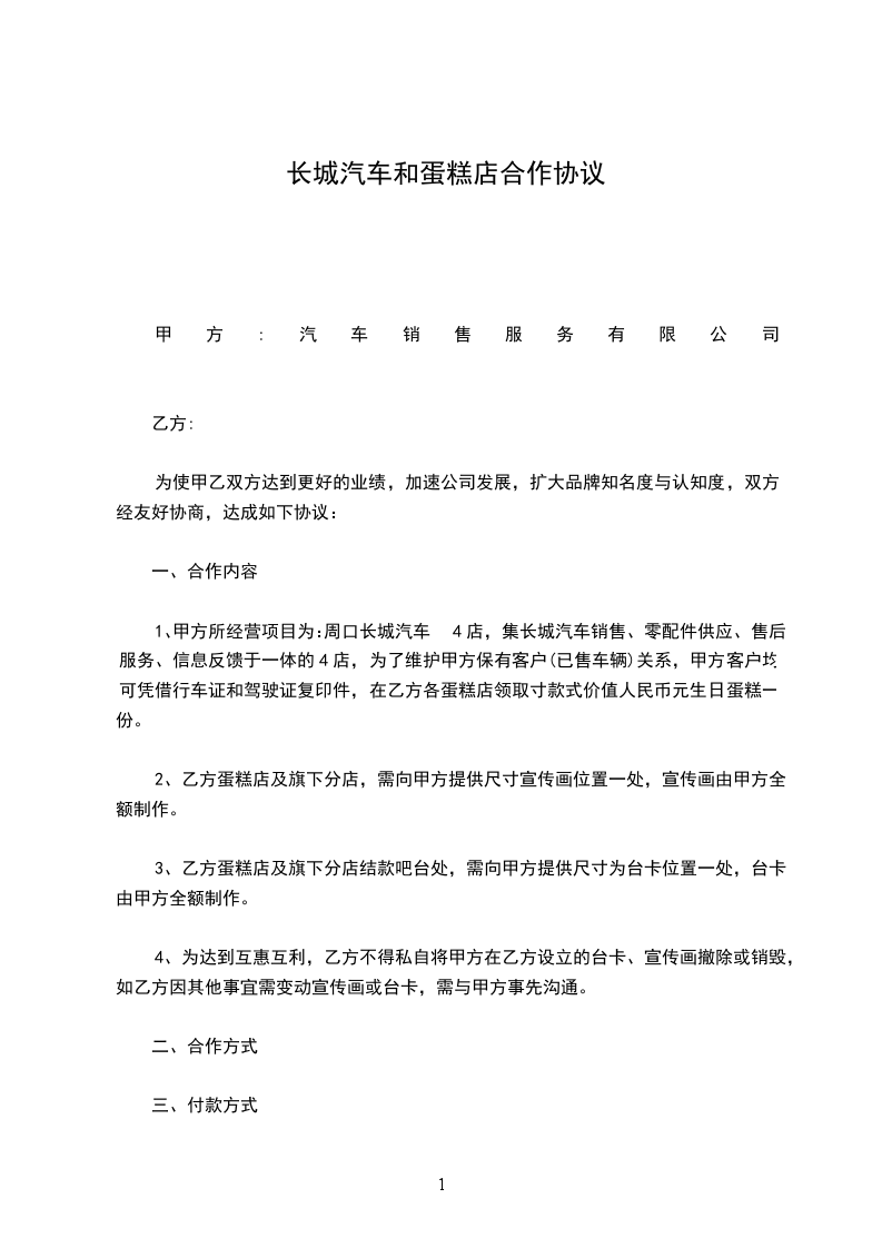 1、甲方所经营项目为:周口长城汽车4店,集长城汽车销售、零配件供应、售后服务、信息反馈于一体的4店,为了维护甲方保有客户(已售车辆)关系,甲方客户均可凭借行车证和驾驶证复印件,在乙方各蛋糕店领取寸款式价值人民币_____元生日蛋糕一份。