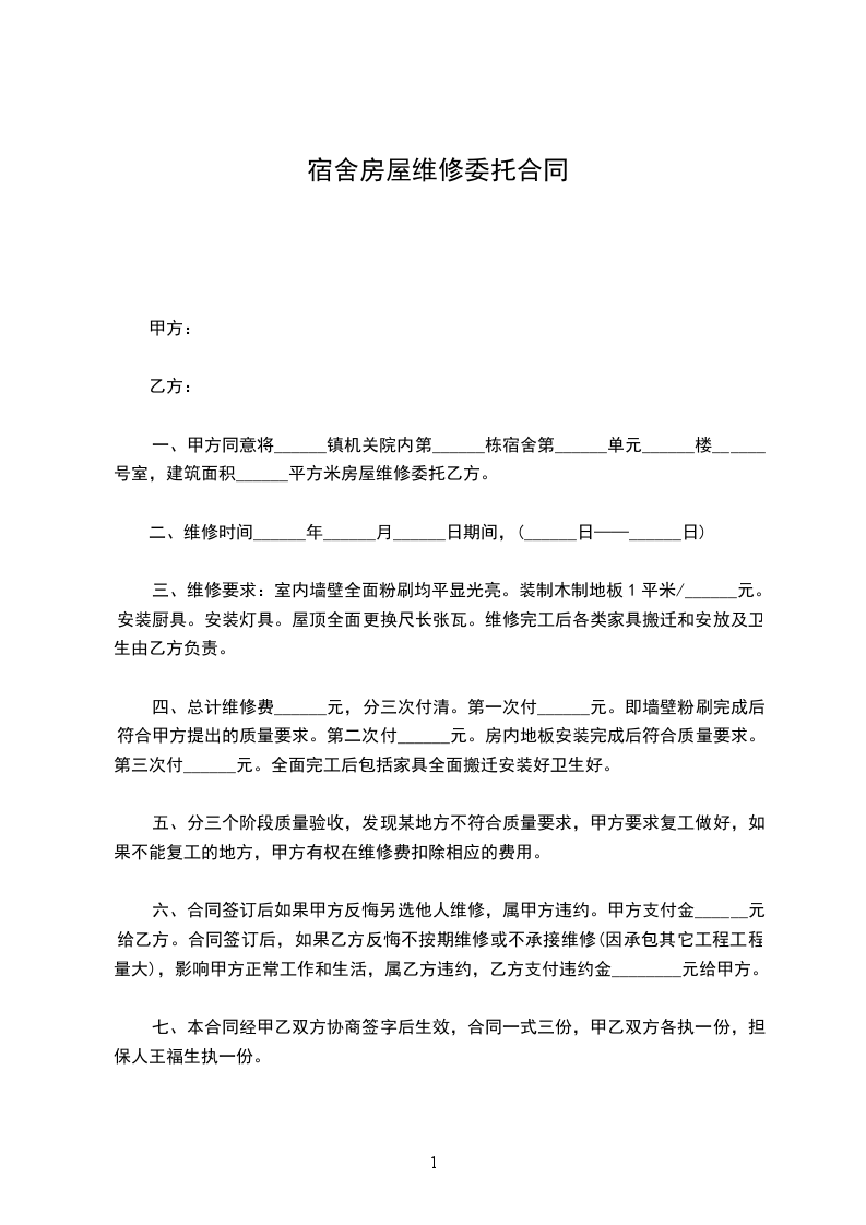 一、甲方同意将______镇机关院内第______栋宿舍第______单元______楼______号室,建筑面积______平方米房屋维修委托乙方。