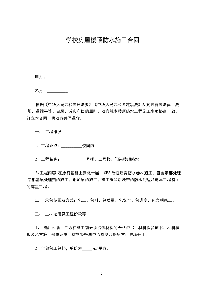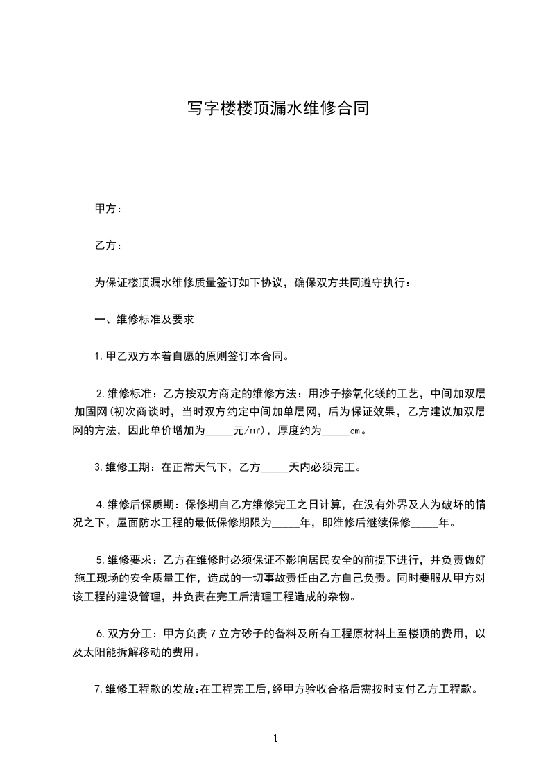一、甲方要求乙方维修屋顶防水______平方,维修单价______元/平方,总计金额______元。屋顶更换的材料要求:防水材料用威牌0.4厘米