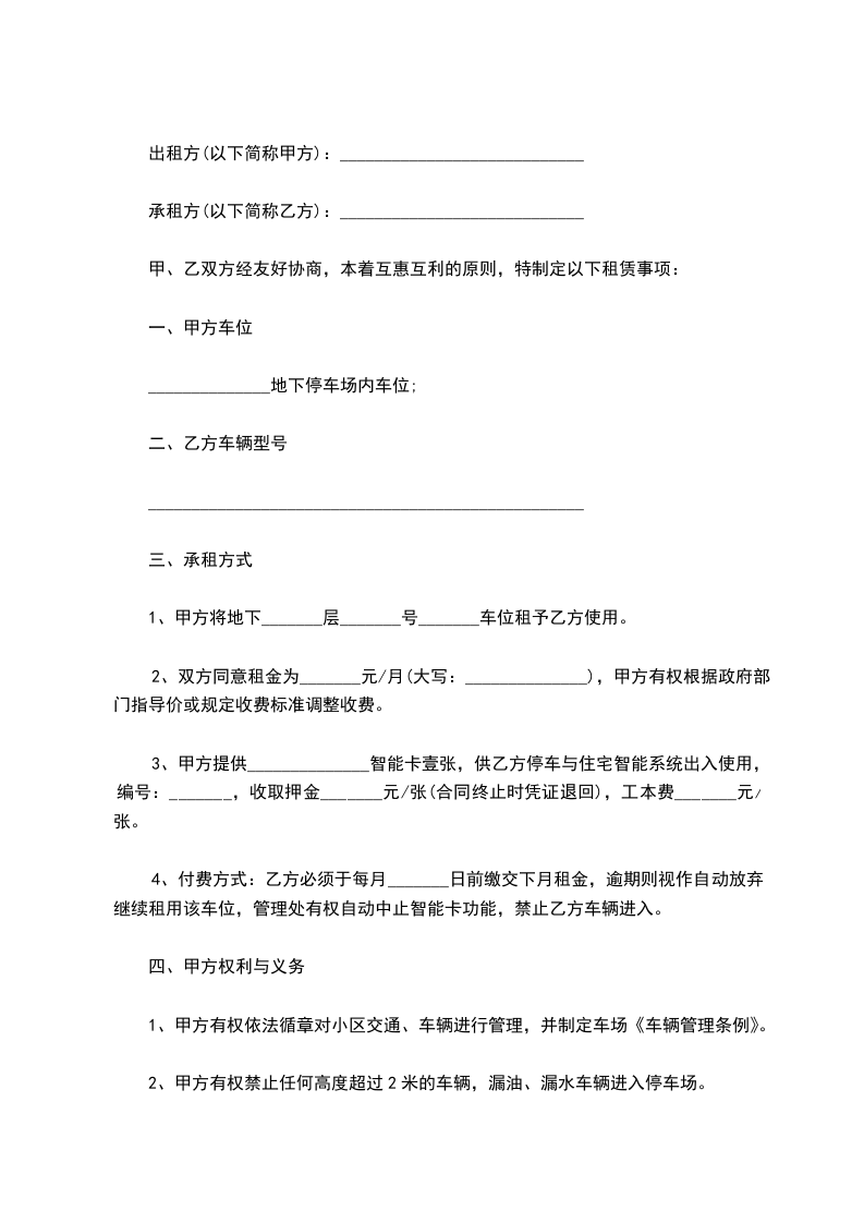 1、甲方将地下_______层_______号_______车位租予乙方使用。