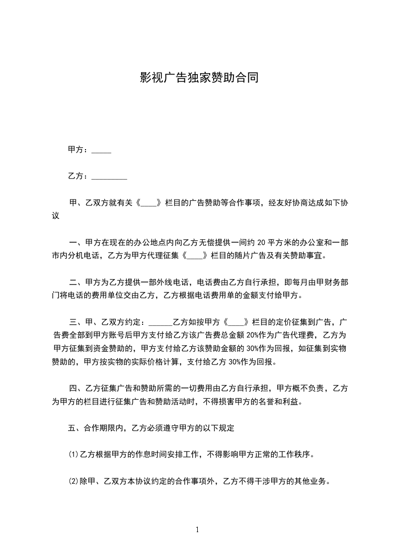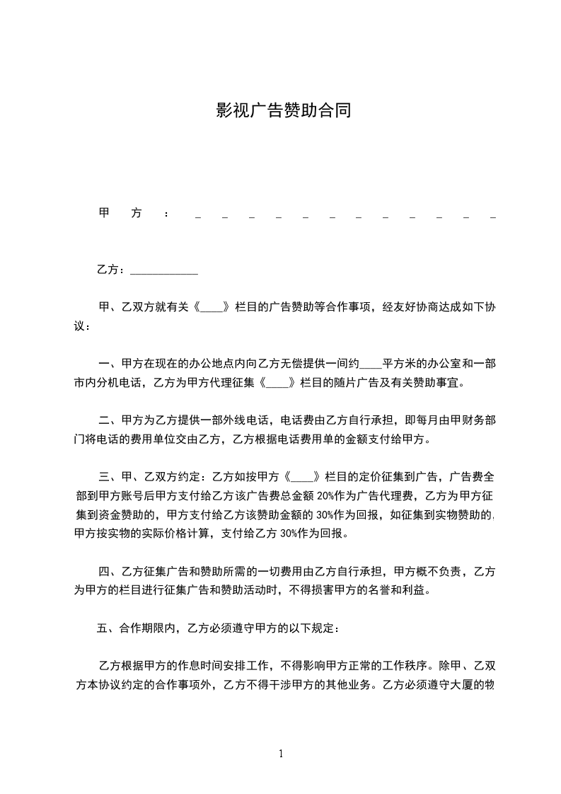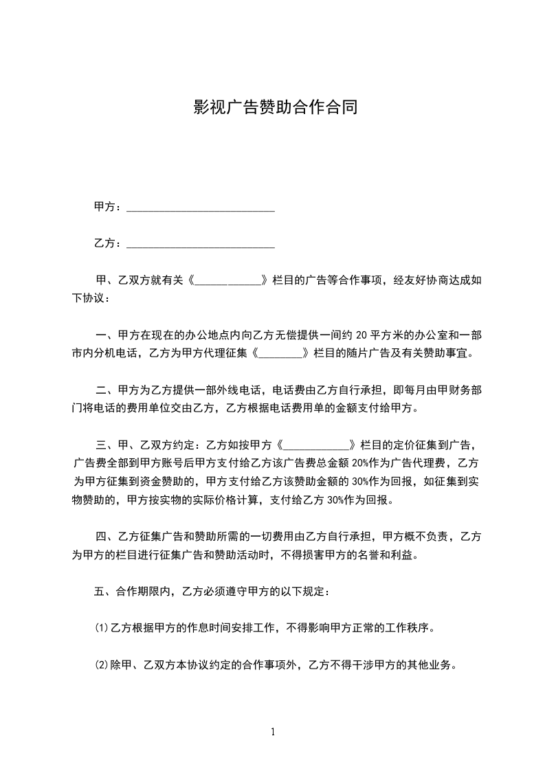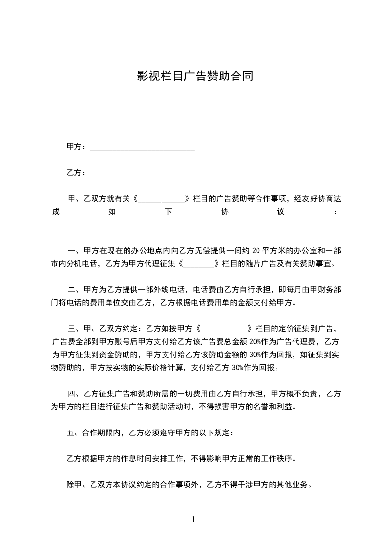 一、甲方在现在的办公地点内向乙方无偿提供一间约20平方米的办公室和一部市内分机电话,乙方为甲方代理征集《_____________________》栏目的随片广告及有关赞助事宜。