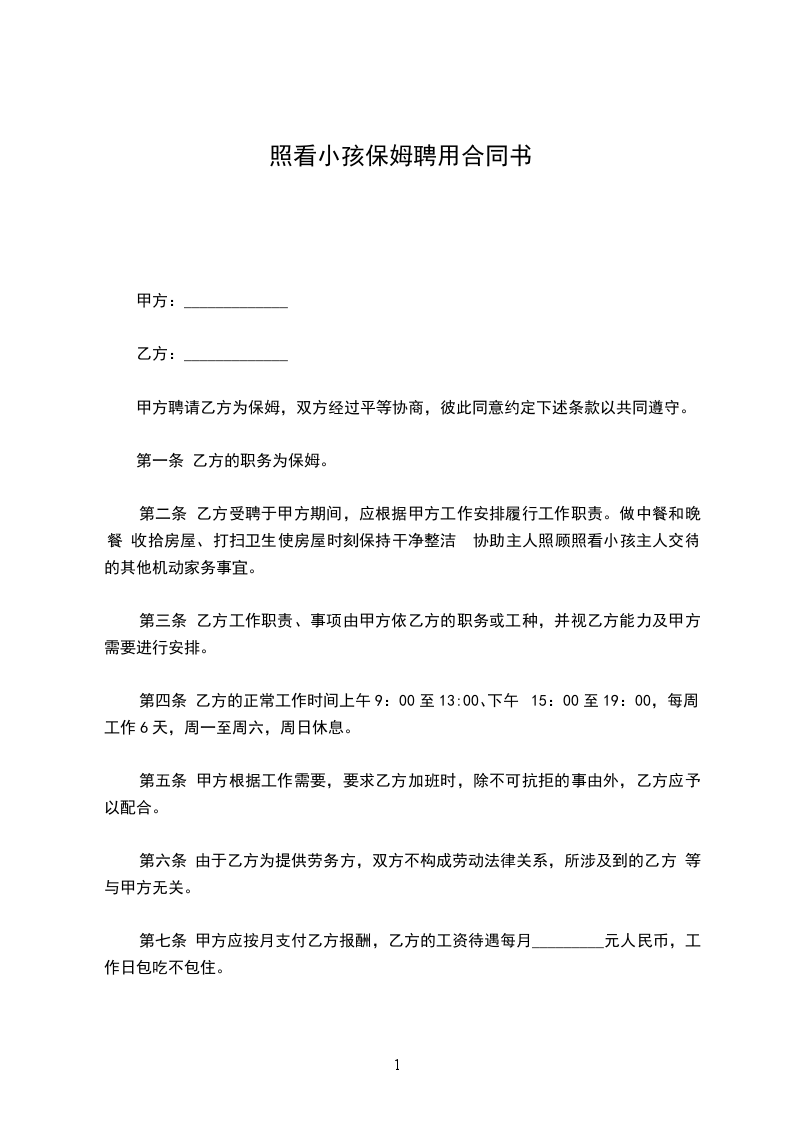 乙方从签订合同之日起,吃住都在甲方家里,全天24小时的照顾家庭的老人,为老人提供完善的家政服务,每月月休四天上六休一。