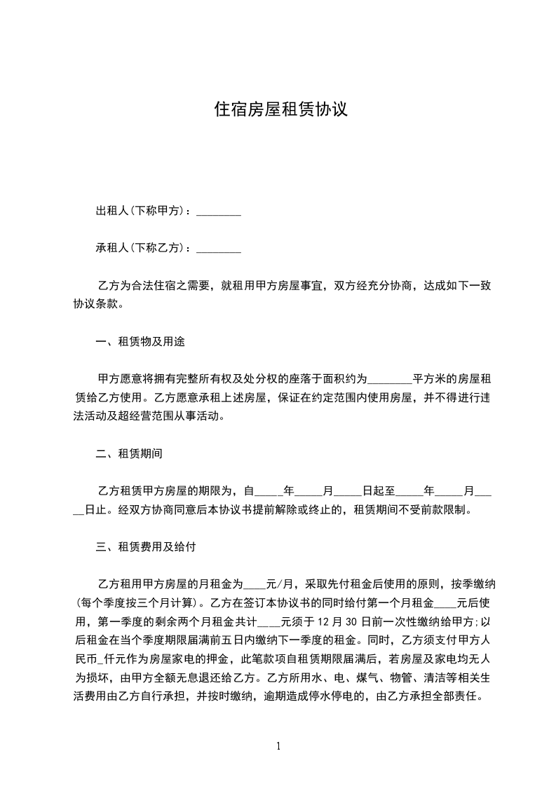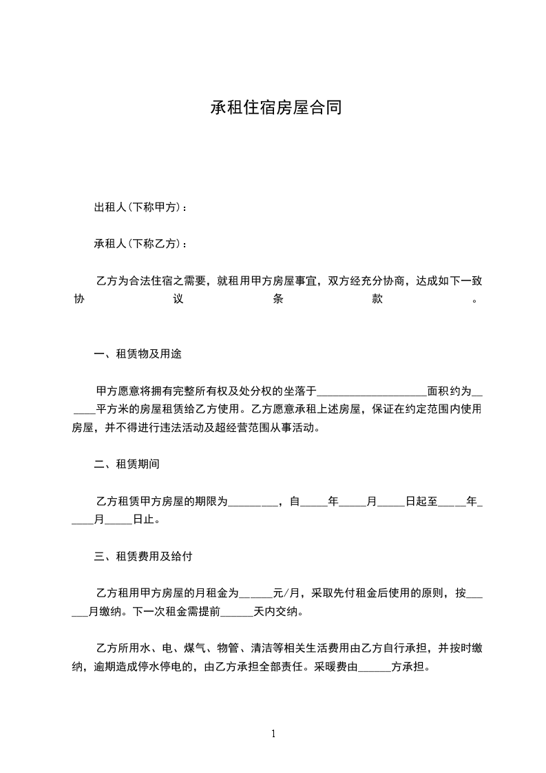 乙方为合法住宿之需要,就租用甲方房屋事宜,双方经充分协商,达成如下一致协议条款。