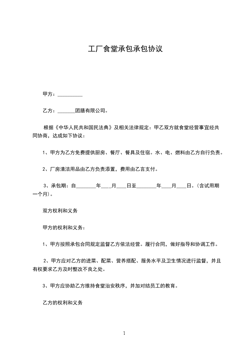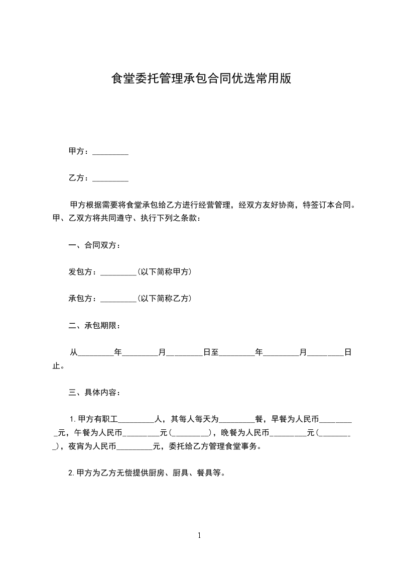 1.甲方有职工_________人,其每人每天为_________餐,早餐为人民币_________元,午餐为人民币_________元(_________),晚餐为人民币_________元(_________),夜宵为人民币_________元,委托给乙方管理食堂事务。