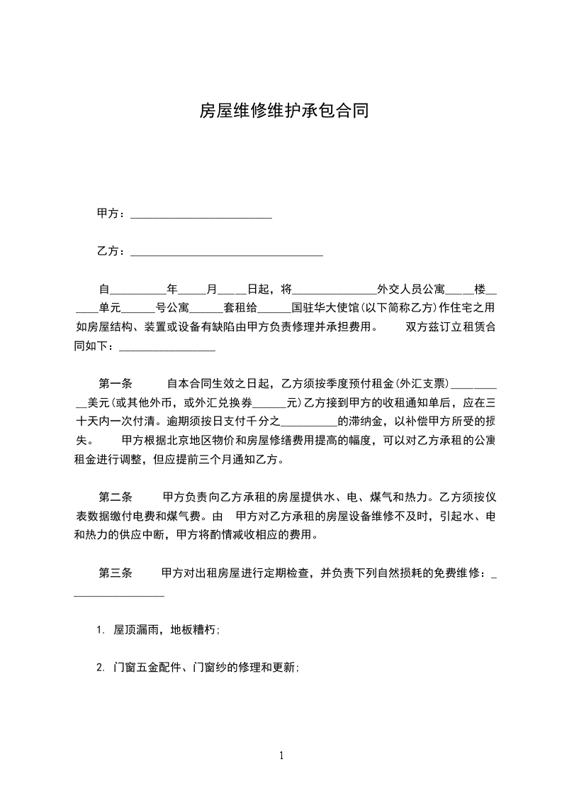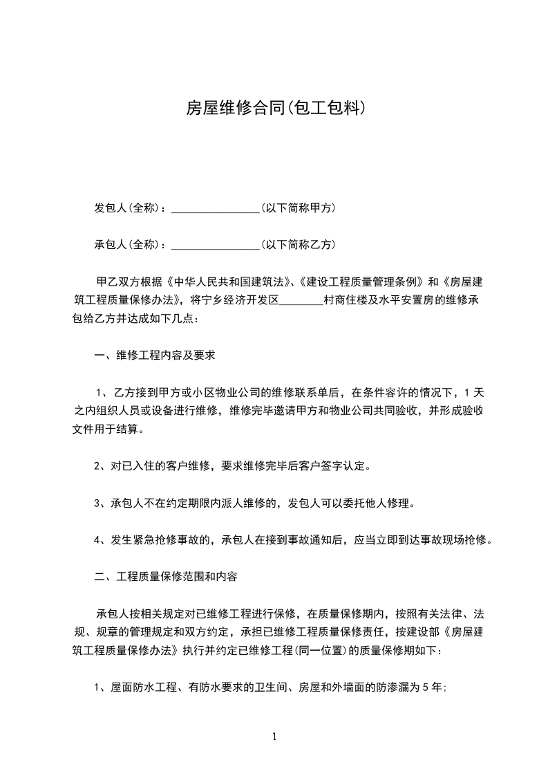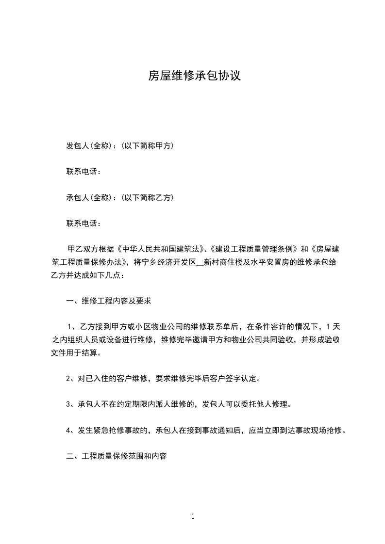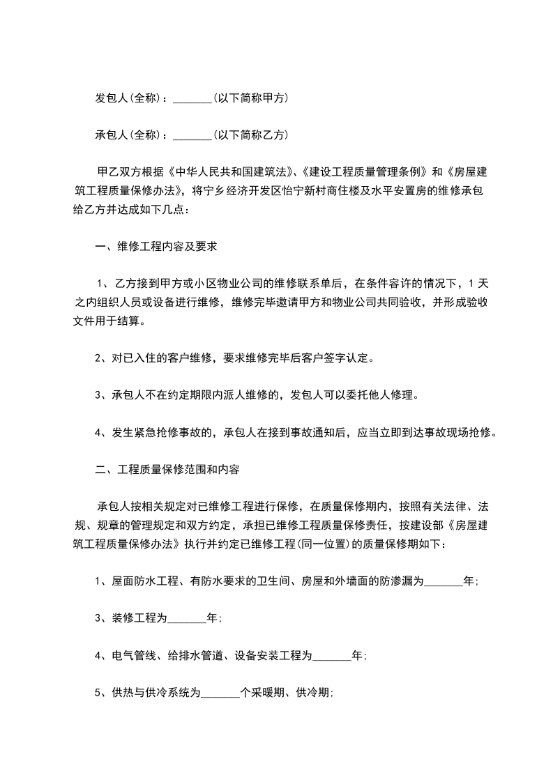 甲乙双方根据《中华人民共和国建筑法》、《建设工程质量管理条例》和《房屋建筑工程质量保修办法》,将宁乡经济开发区________村商住楼及水平安置房的维修承包给乙方并达成如下几点: