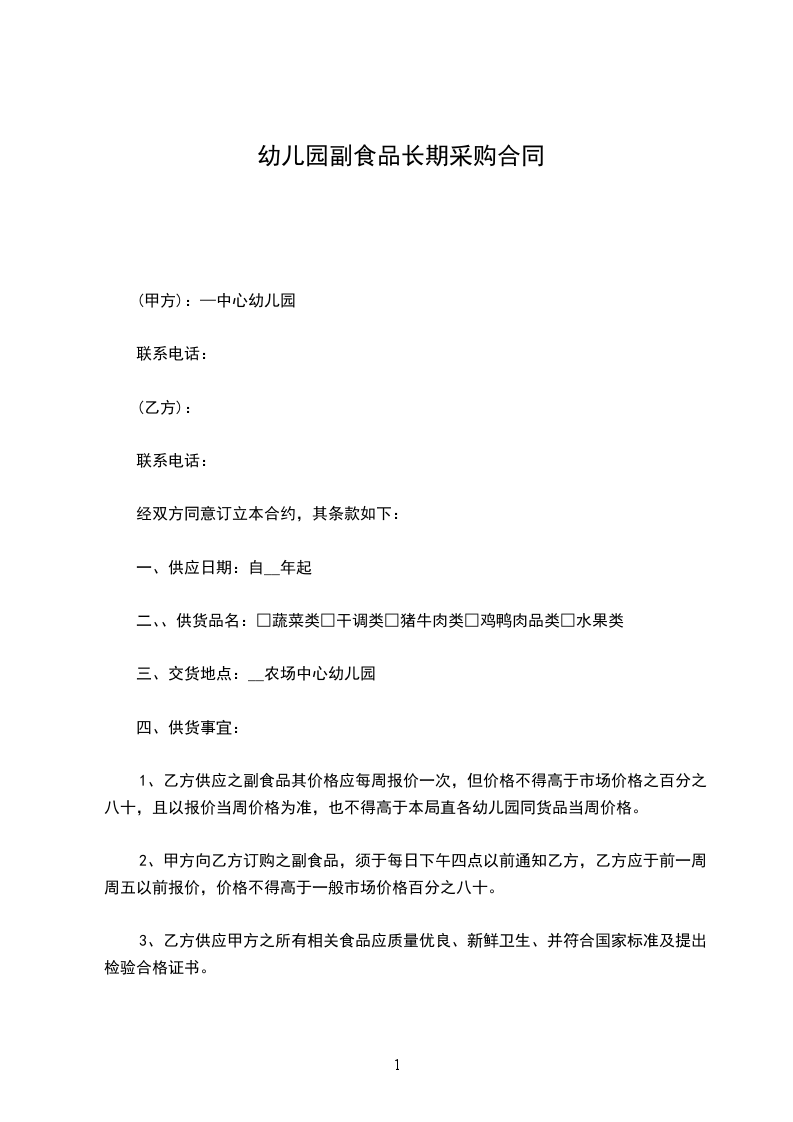 1、乙方供应之副食品其价格应每周报价一次,但价格不得高于市场价格之百分之八十,且以报价当周价格为准,也不得高于本局直各幼儿园同货品当周价格。
