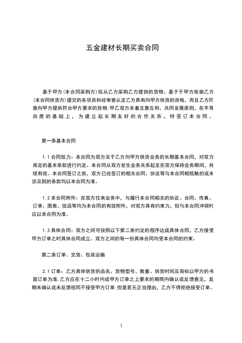 1.1合同效力:本合同为双方关于乙方向甲方供货业务的长期基本合同,对双方商定的基本条款进行约定。本合同从双方发生业务关系起至在双方保持业务期间,持续有效。本合同签订之前,双方已经签订的相关合同、协议等与本合同相抵触的或未涉及到的条款均以本合同为准。