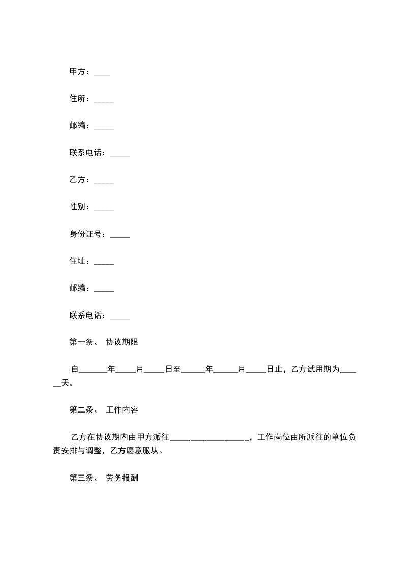 乙方在协议期内由甲方派往___________________,工作岗位由所派往的单位负责安排与调整,乙方愿意服从。