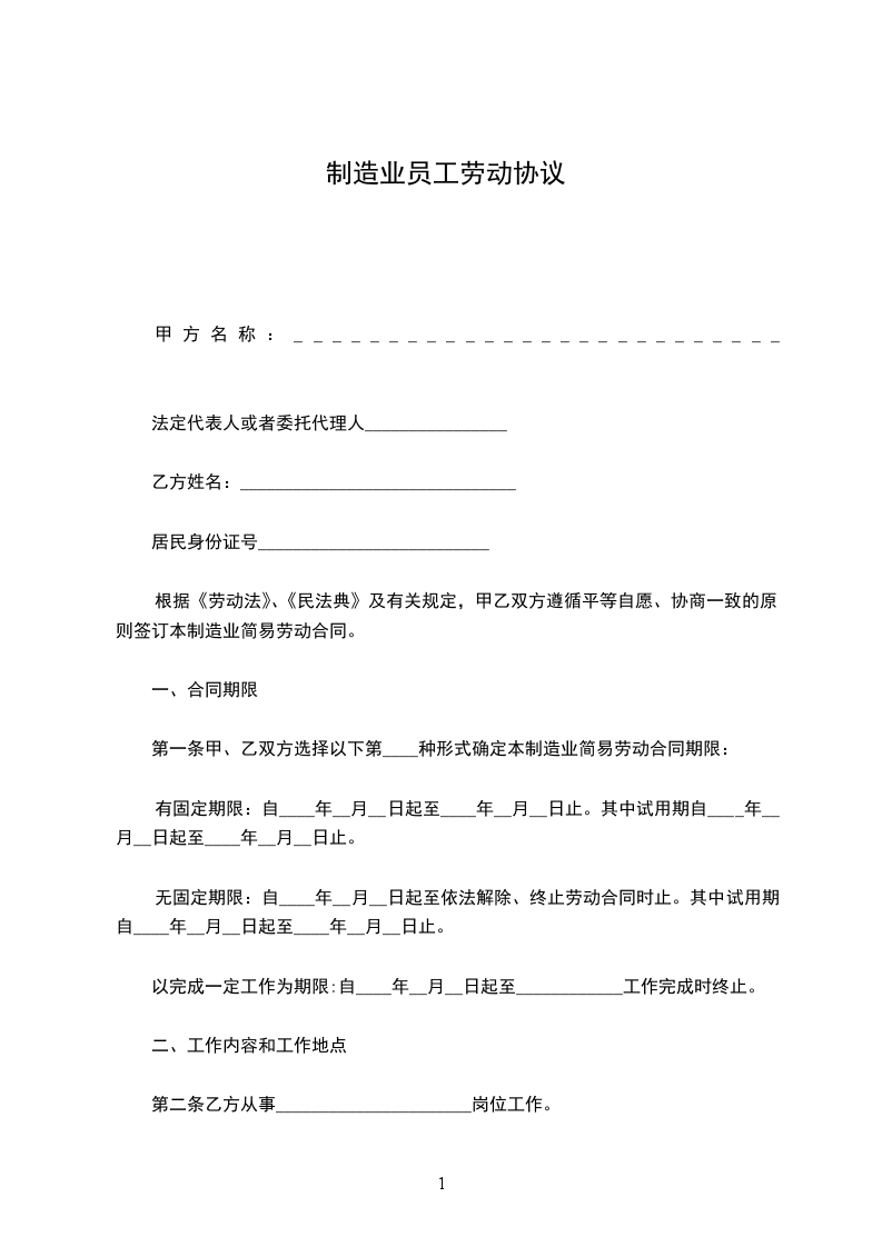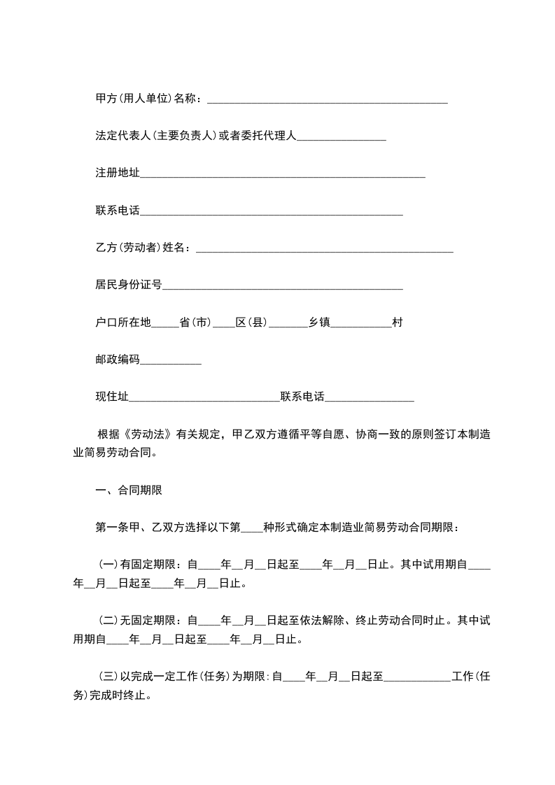 第一条甲、乙双方选择以下第____种形式确定本制造业简易劳动合同期限: