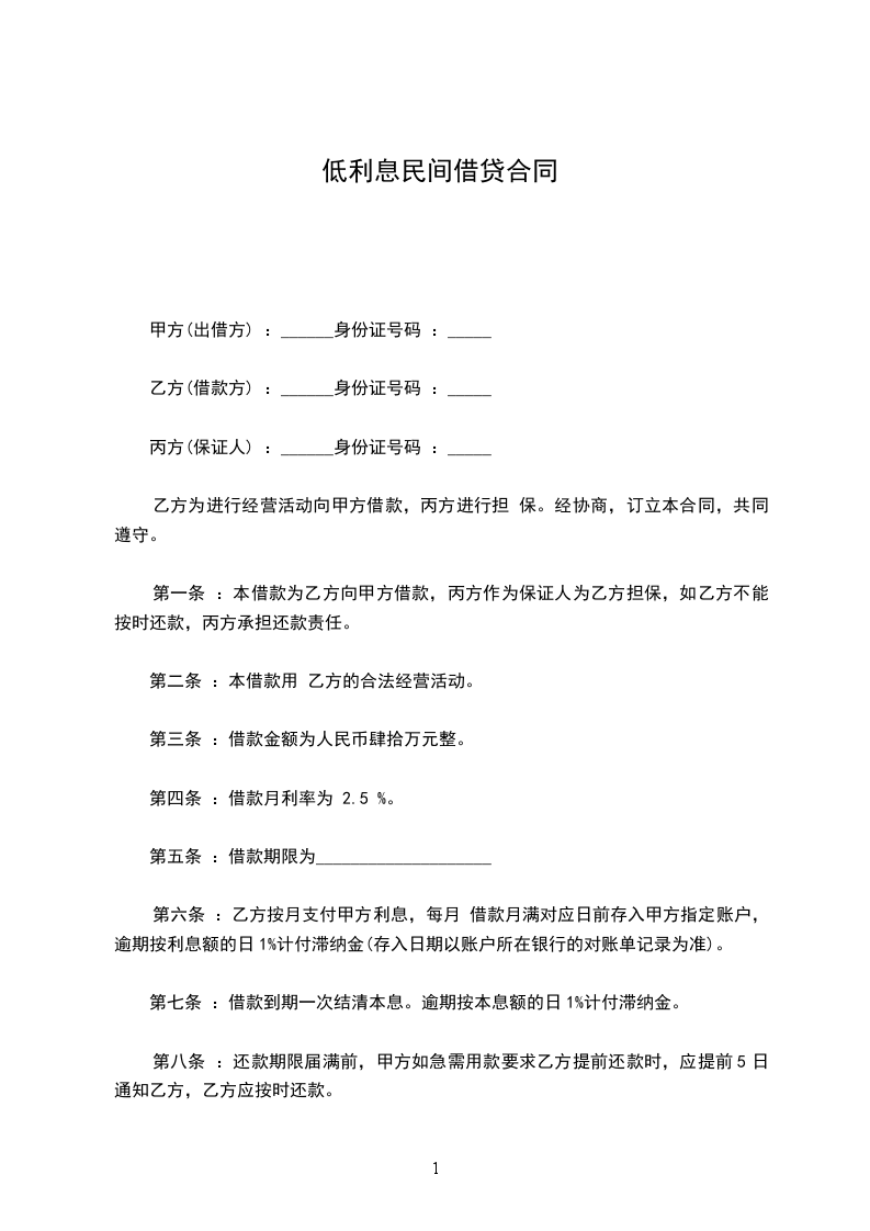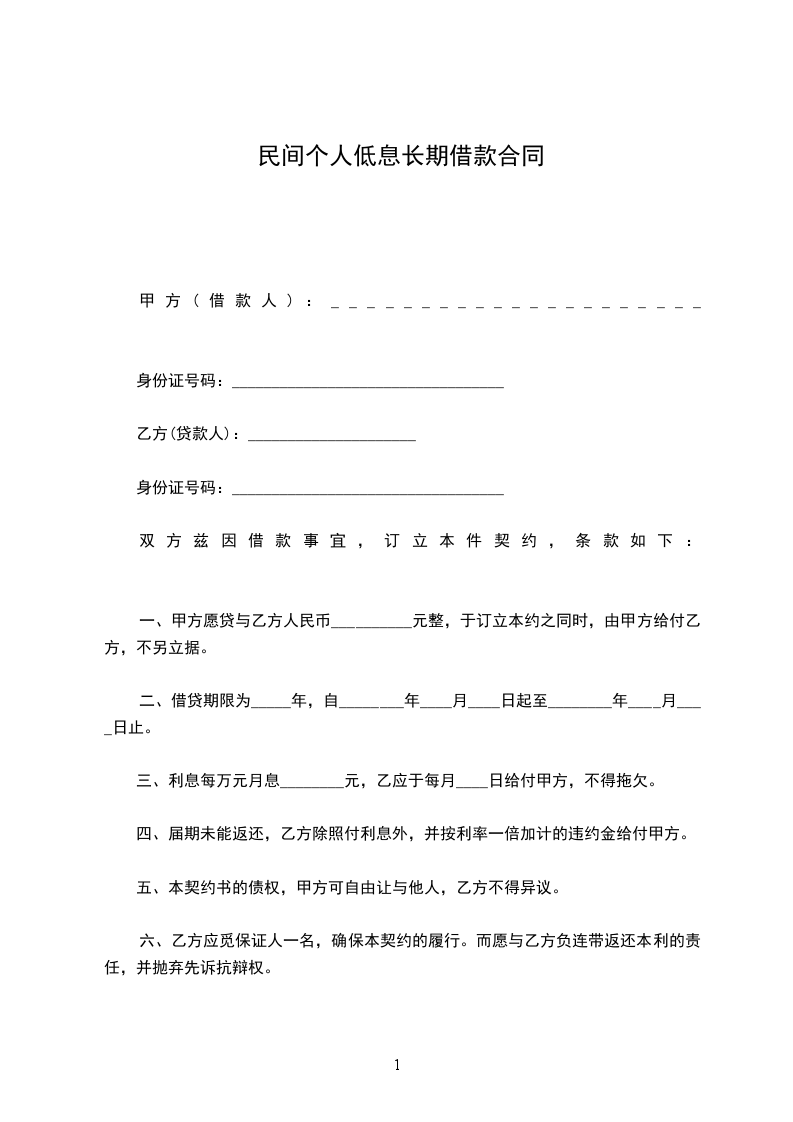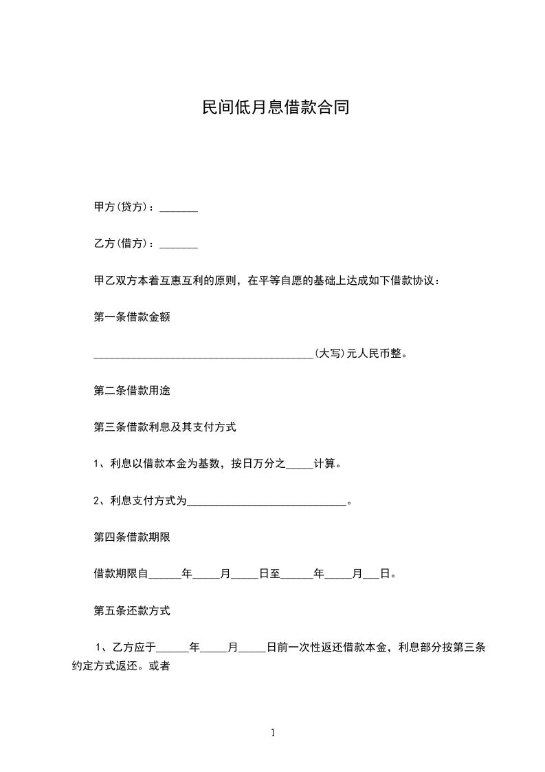 一、甲方愿贷与乙方人民币__________元整,于订立本约之同时,由甲方给付乙方,不另立据。