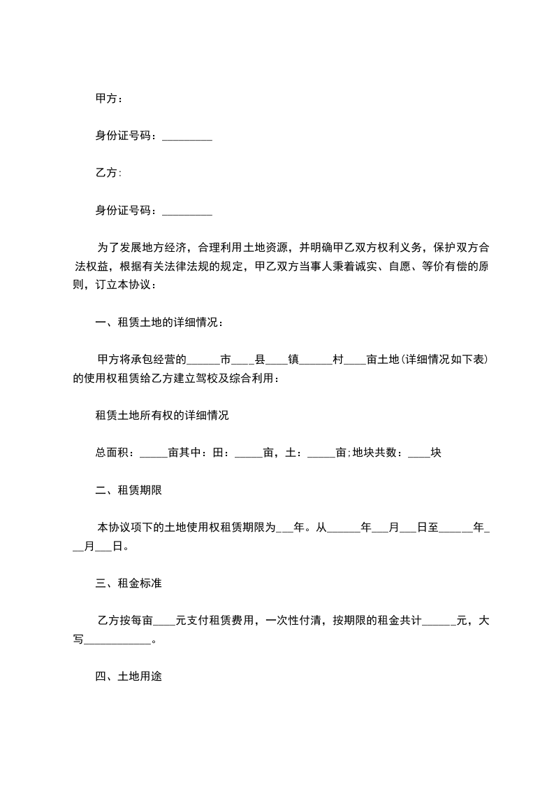 甲方将承包经营的______市____县____镇______村____亩土地(详细情况如下表)的使用权租赁给乙方建立驾校及综合利用: