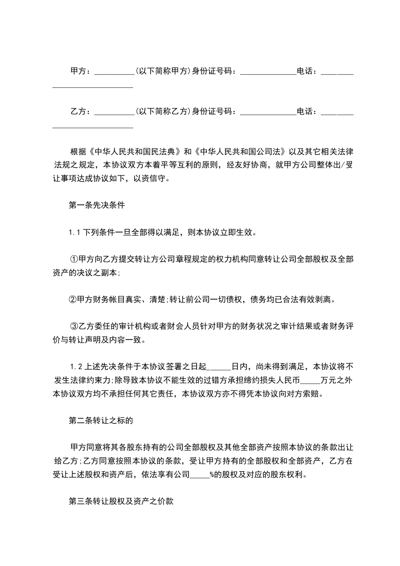 根据《中华人民共和国民法典》和《中华人民共和国公司法》以及其它相关法律法规之规定,本协议双方本着平等互利的原则,经友好协商,就甲方公司整体出/受让事项达成协议如下,以资信守。
