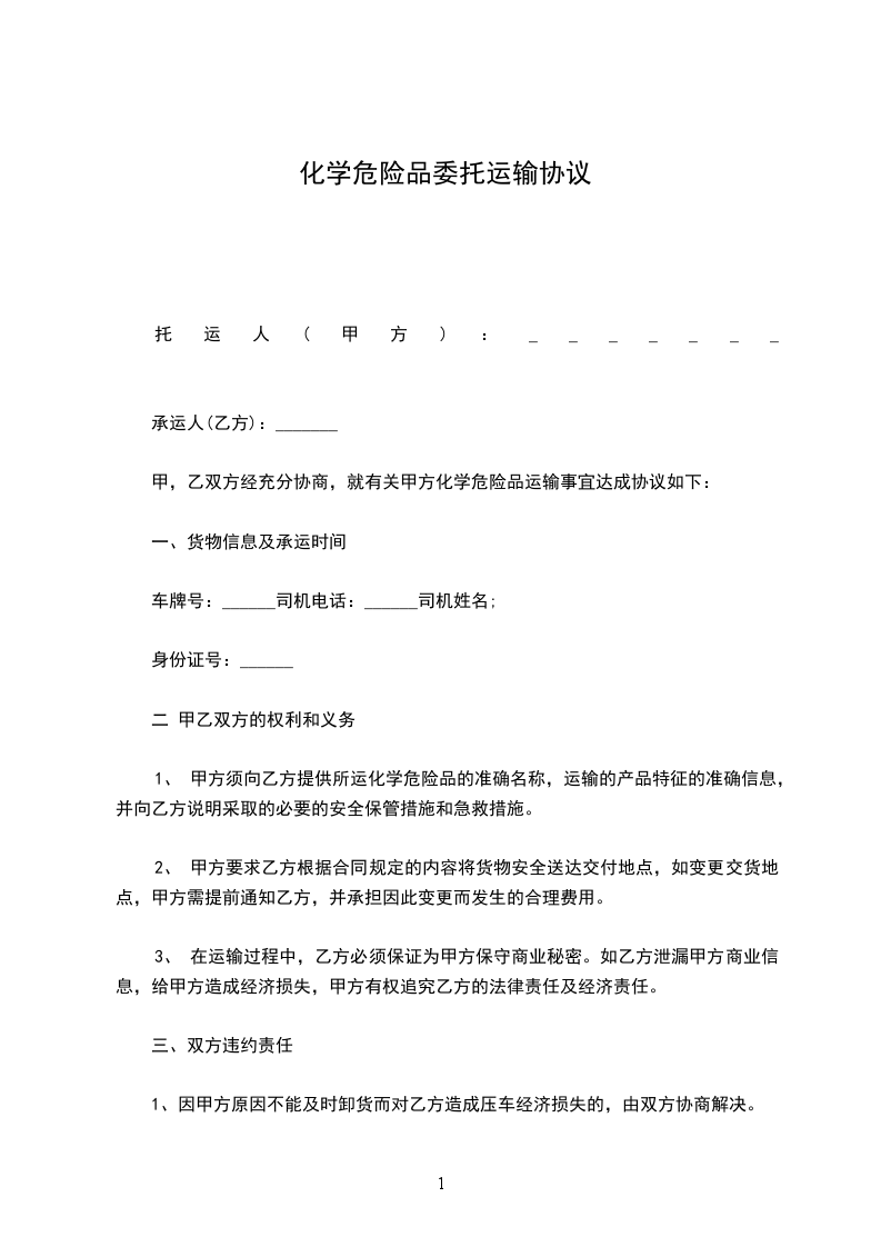根据国家安全运输危险品的规定和重庆市有关文件要求,甲方委托乙方负责承运甲方生产的危险化学品,为明确双方的安全权利和义务,经双方友好协商,达成如下协议: