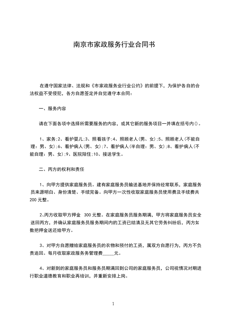 1、向甲方提供家庭服务员。建有家庭服务员输送基地并保持经常联系,家庭服务员来源明白、身份清楚、手续完备。向甲方一次性收取家庭服务员使用费及手续费共200元整。