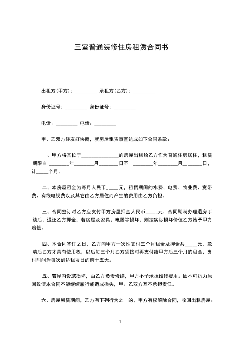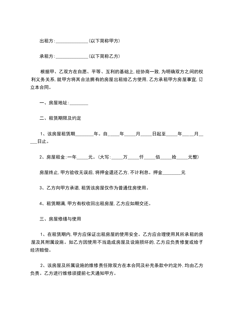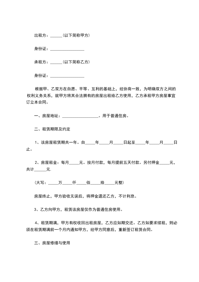 第八条甲方收乙方押金____元(大写____:)乙方退房时,结清水、电、气费。交还钥匙后,由甲方退还乙方押金。