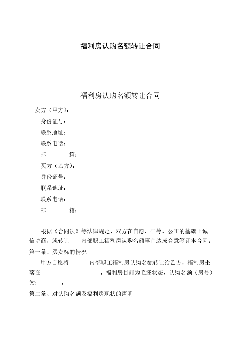 甲方自愿将 内部职工福利房认购名额转让给乙方,福利房坐落在 。福利房目前为毛坯状态,认购名额(房号)为: 。