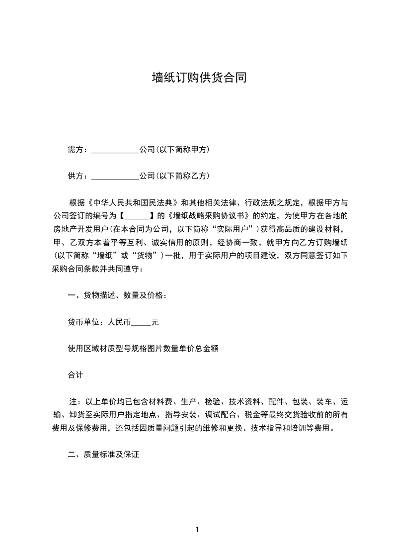 根据《中华人民共和国民法典》和其他相关法律、行政法规之规定,根据甲方与公司签订的编号为【______】的《墙纸战略采购协议书》的约定,为使甲方在各地的房地产开发用户(在本合同为公司,以下简称“实际用户”)获得高品质的建设材料,甲、乙双方本着平等互利、诚实信用的原则,经协商一致,就甲方向乙方订购墙纸(以下简称“墙纸”或“货物”)一批,用于实际用户的项目建设,双方同意签订如下采购合同条款并共同遵守: