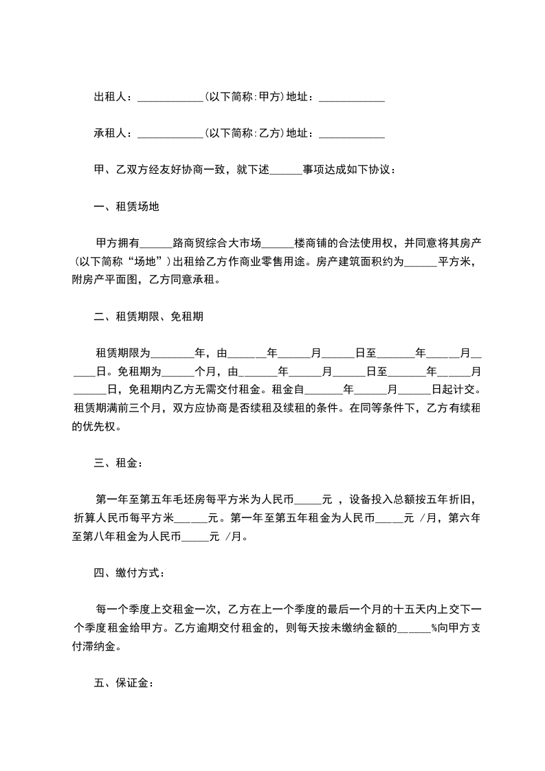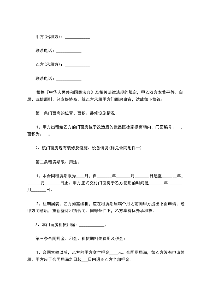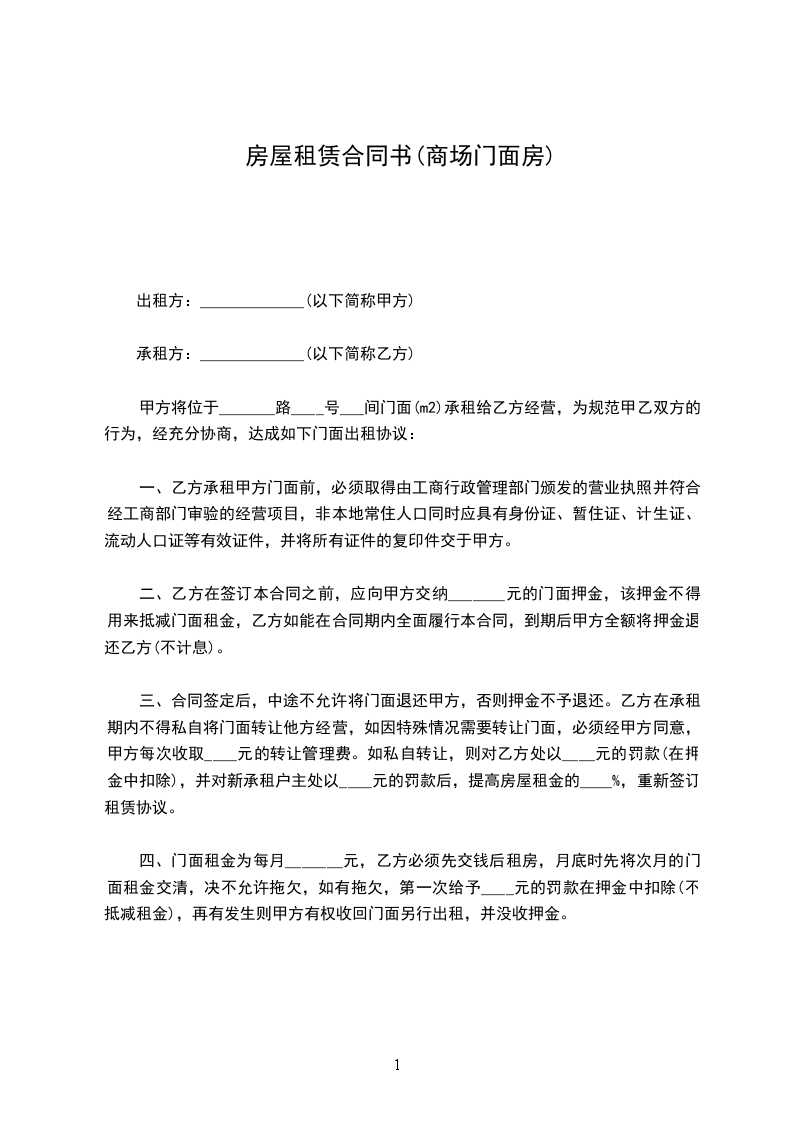 一、甲方将座落于县城________汽车站____商场靠车站汽车站一间面积为____平方米的临街门面租赁给乙方,作____使用。