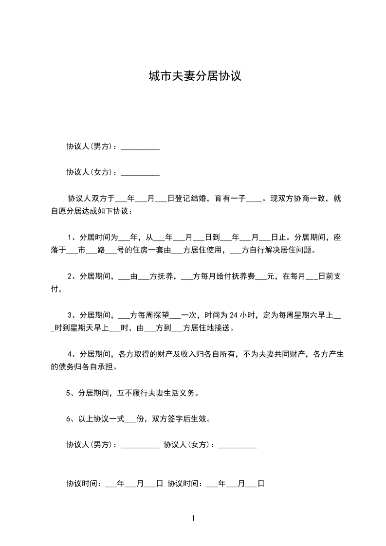 协议人双方于___年___月___日登记结婚,育有一子____。现双方协商一致,就自愿分居达成如下协议:
