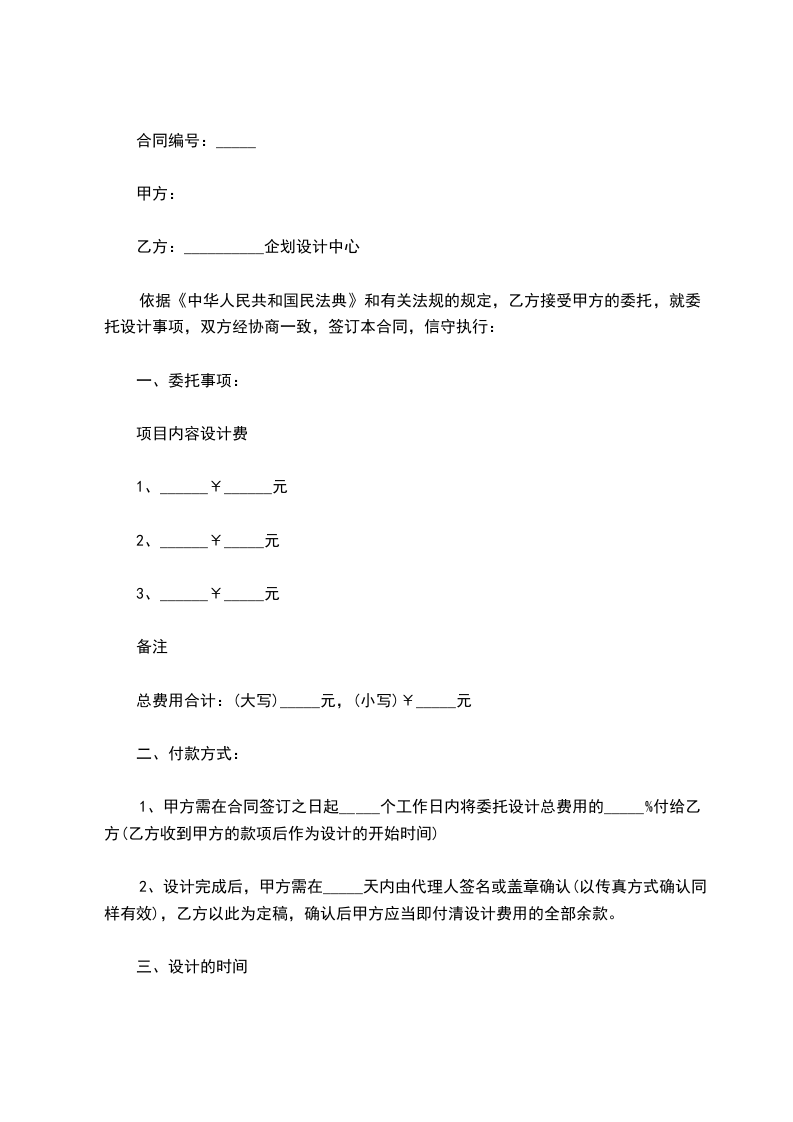 2、设计完成后,甲方需在___天内由代理人签名或盖章确认(以传真方式确认同样有效),乙方以此为定稿,确认后甲方应当即付清设计费用的全部余款。