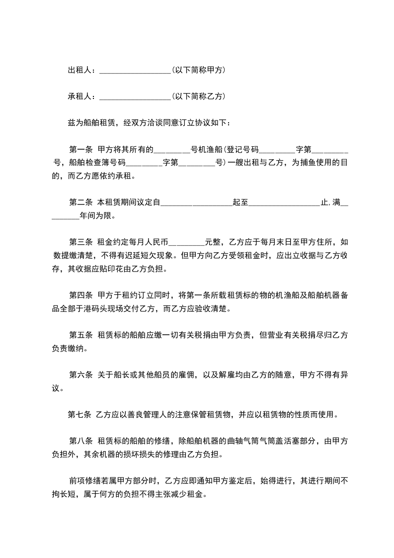 第一条 甲方将其所有的_________号机渔船(登记号码_________字第_________号,船舶检查簿号码_________字第_________号)一艘出租与乙方,为捕鱼使用的目的,而乙方愿依约承租。